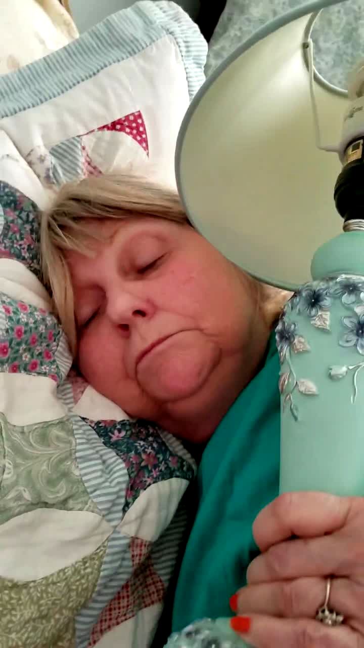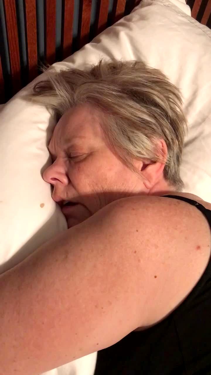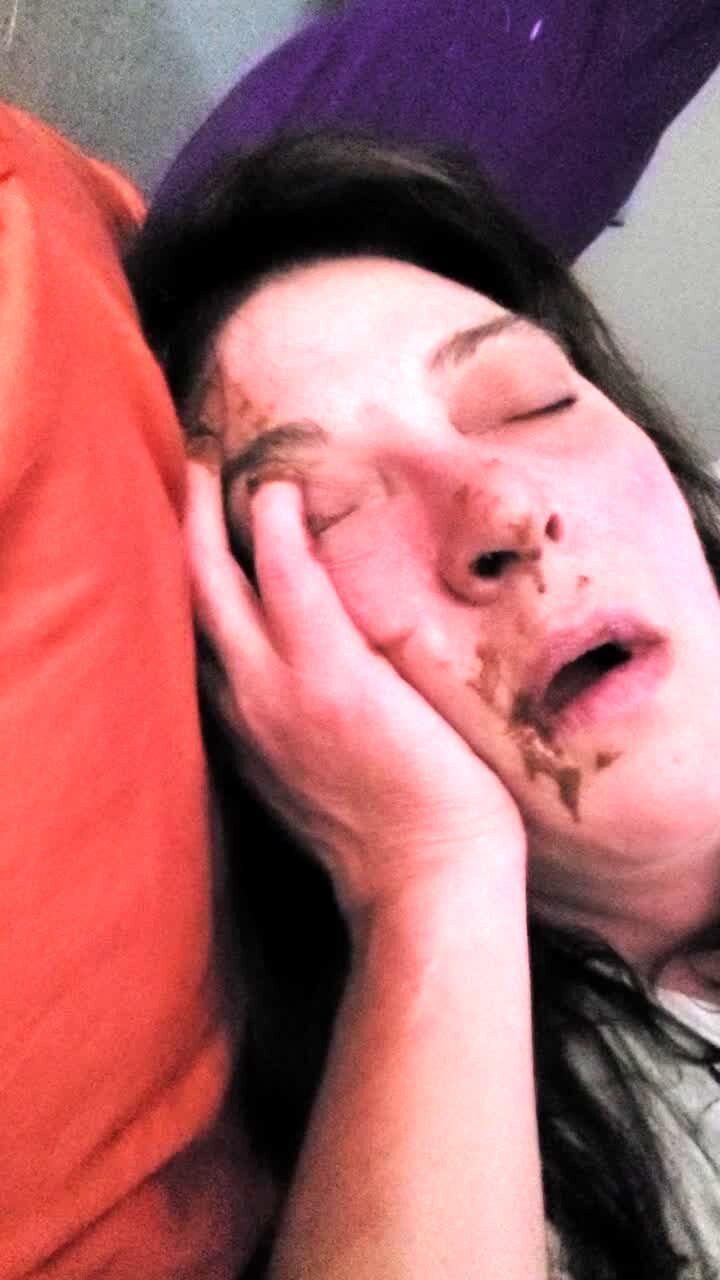 A man films a woman who fell asleep in bed eating chocolate which is still smeared all over her face.
