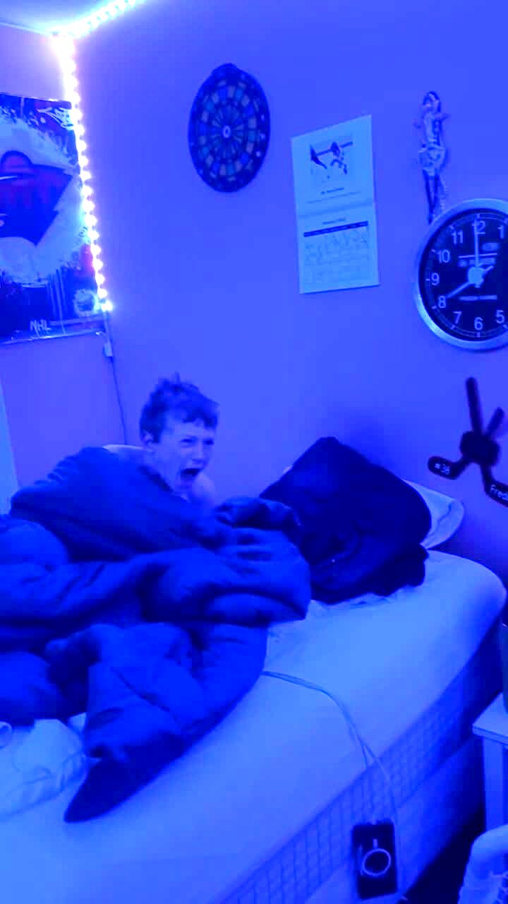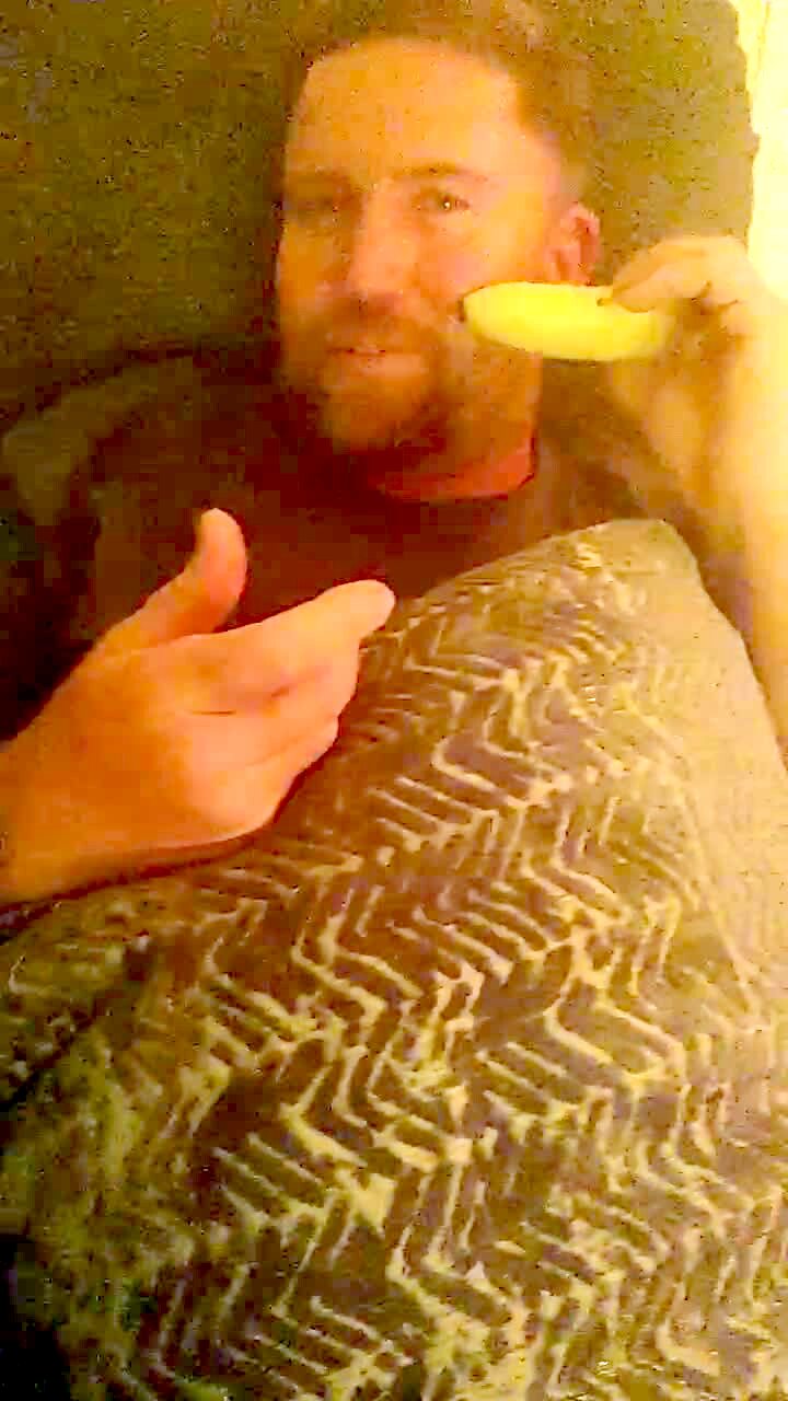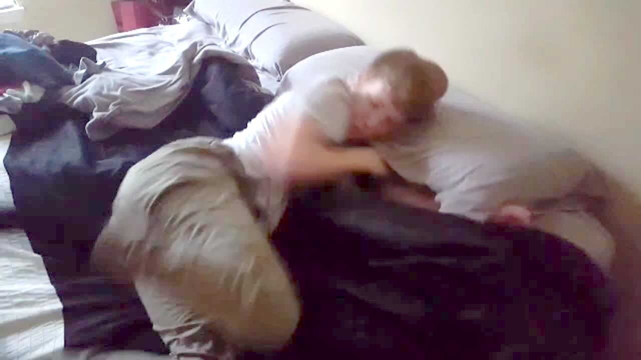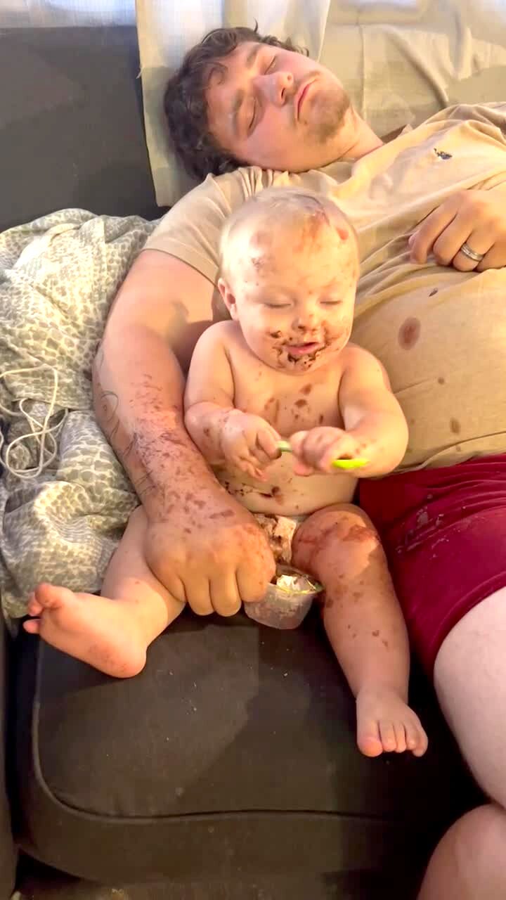 A man films a woman who fell asleep in bed eating chocolate which is still smeared all over her face.