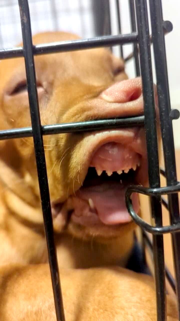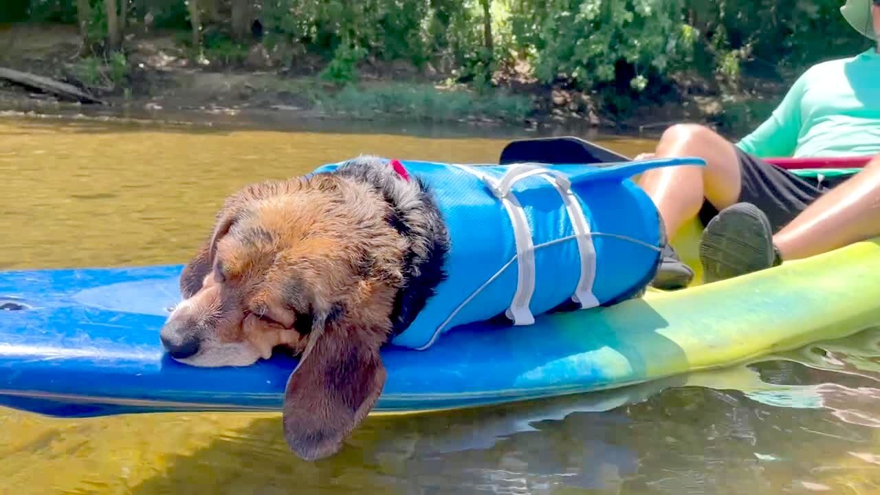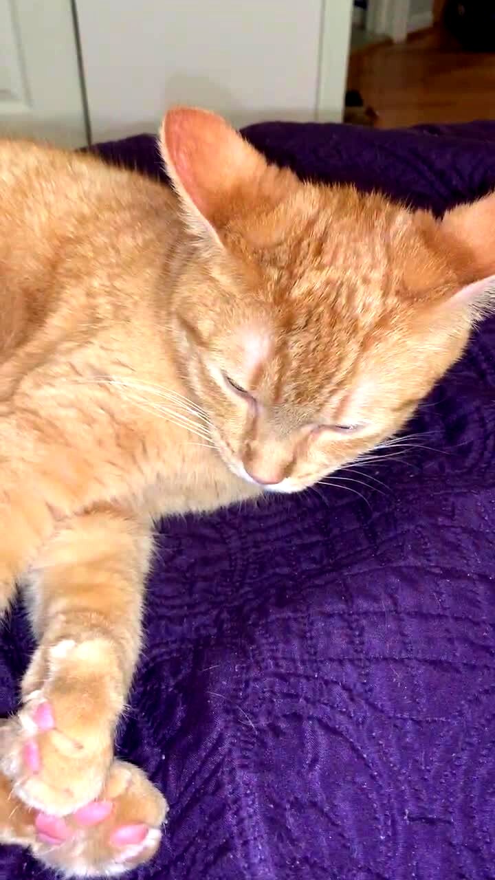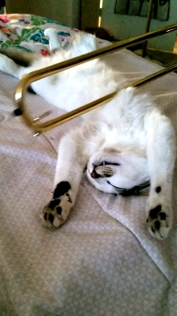 A cat meows as he sleeps on his back until a dog's tail hits him, and he wakes up and hisses.