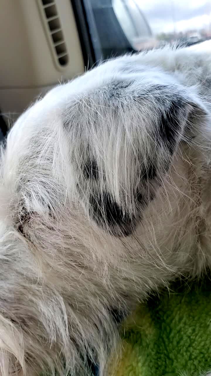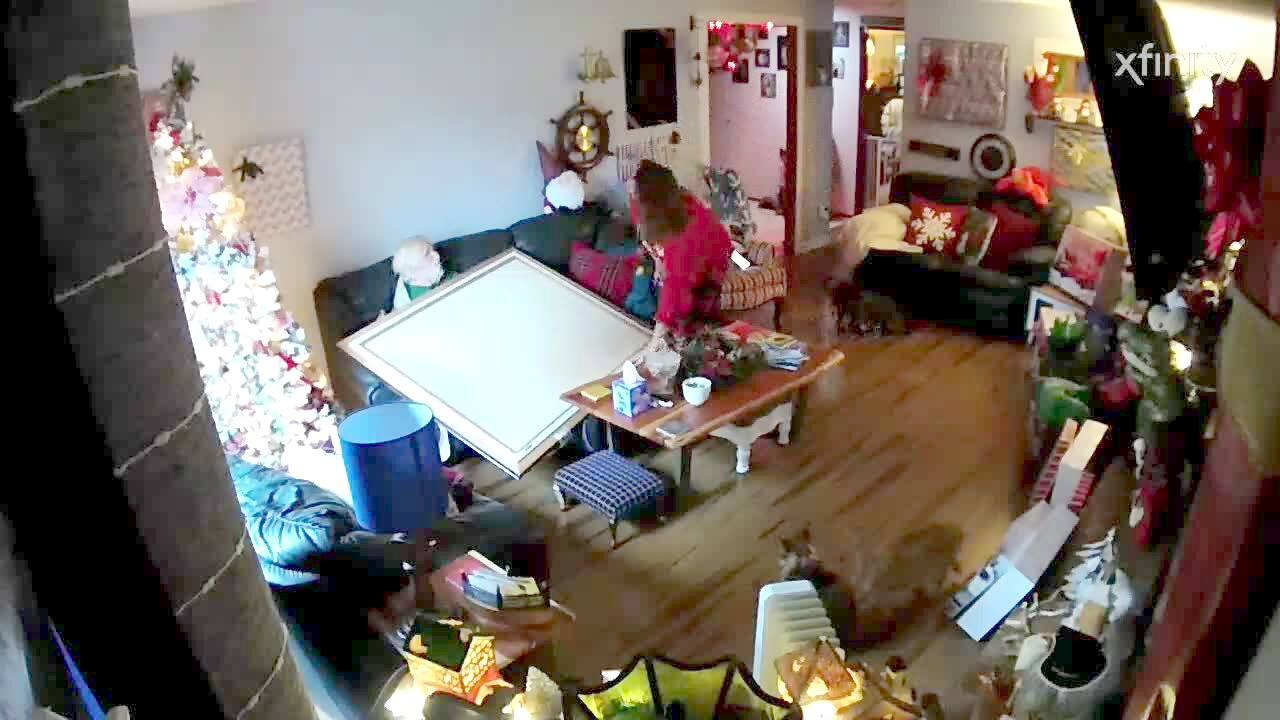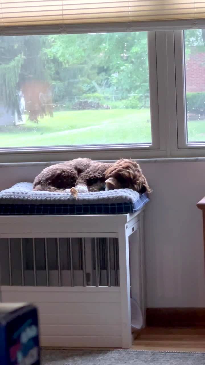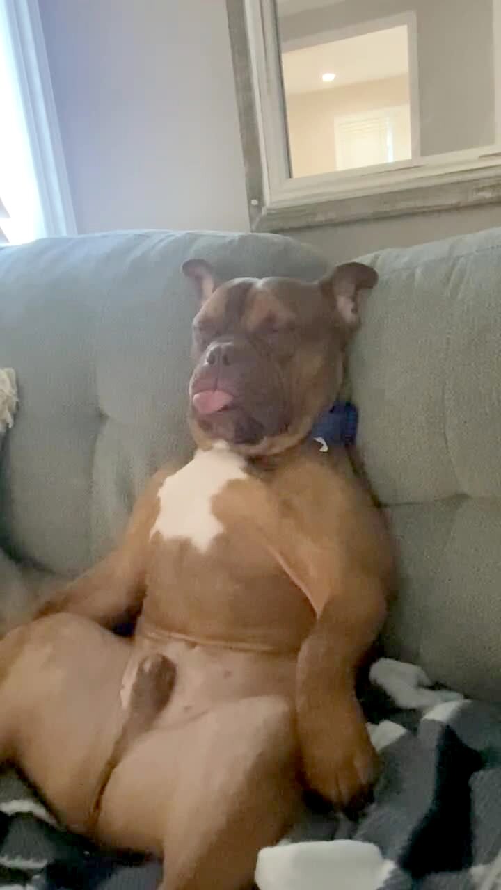 A man whistles to his dog, and she wakes up and falls off the living room couch.
