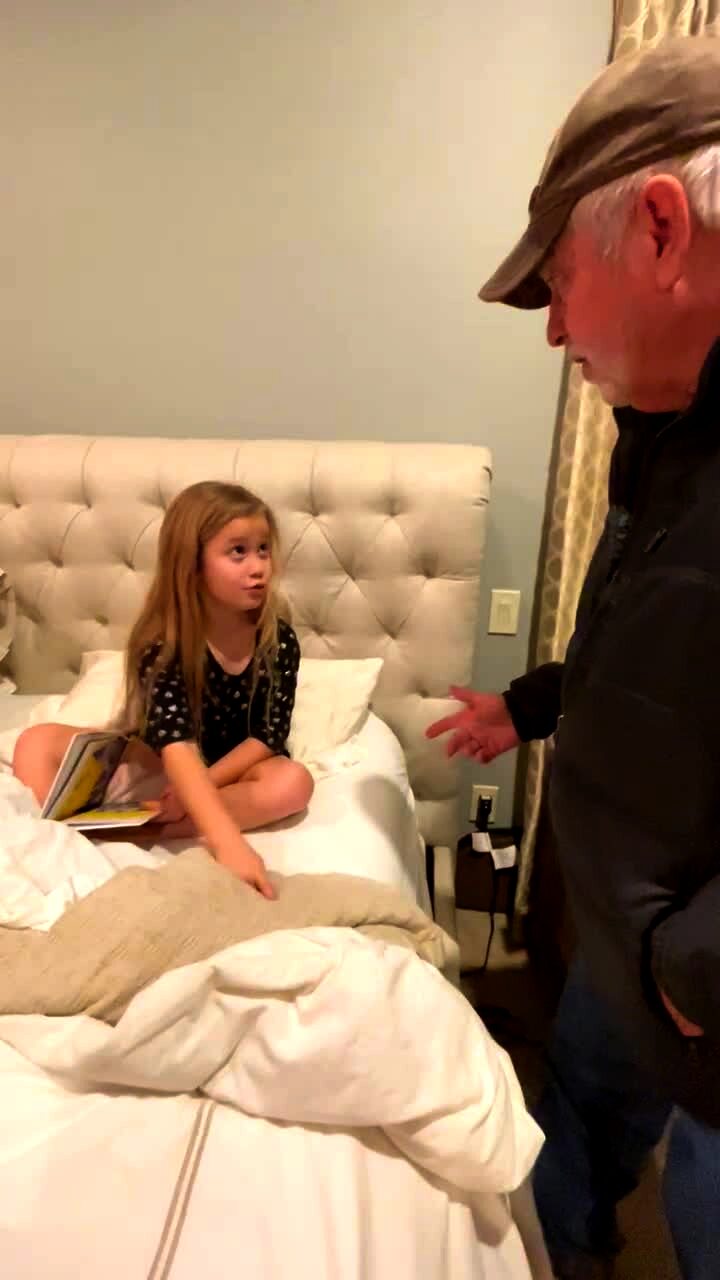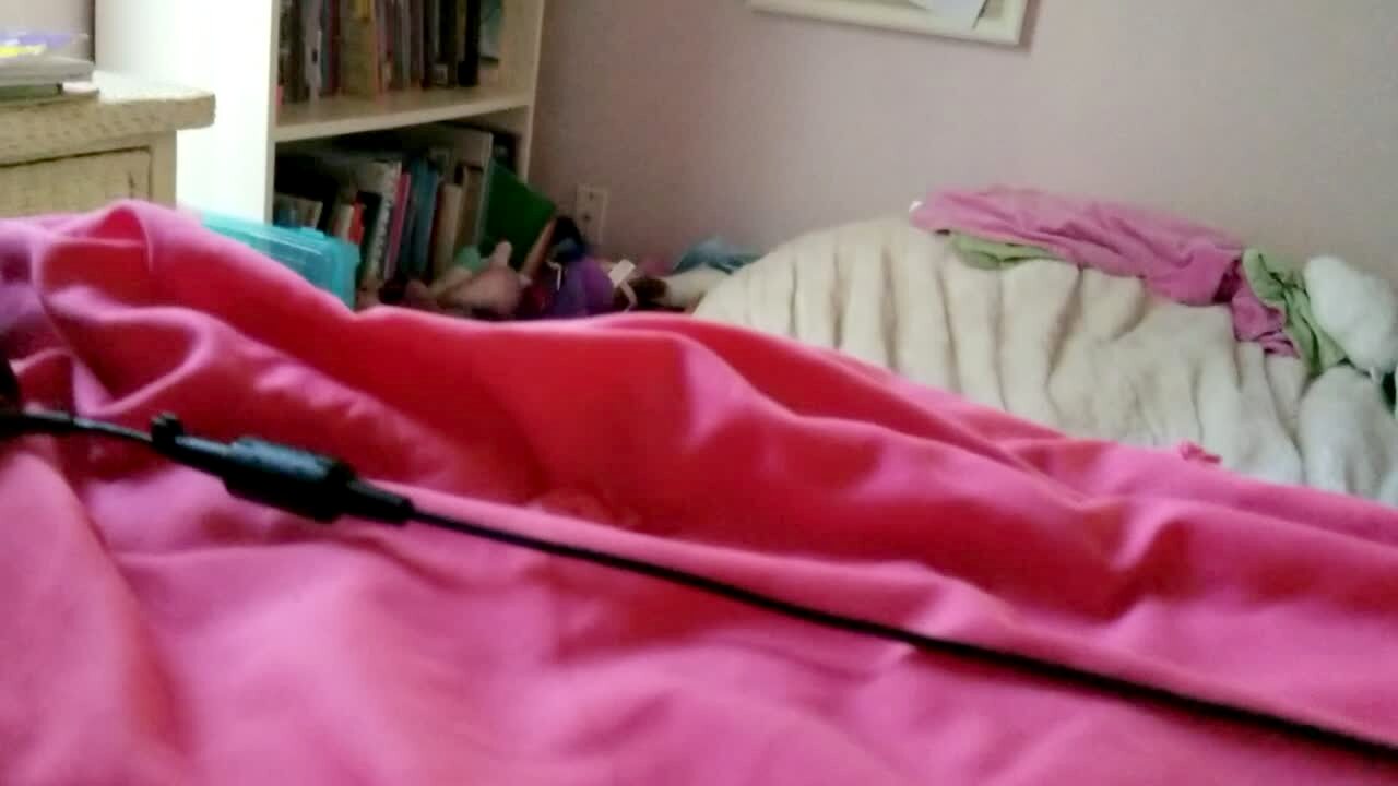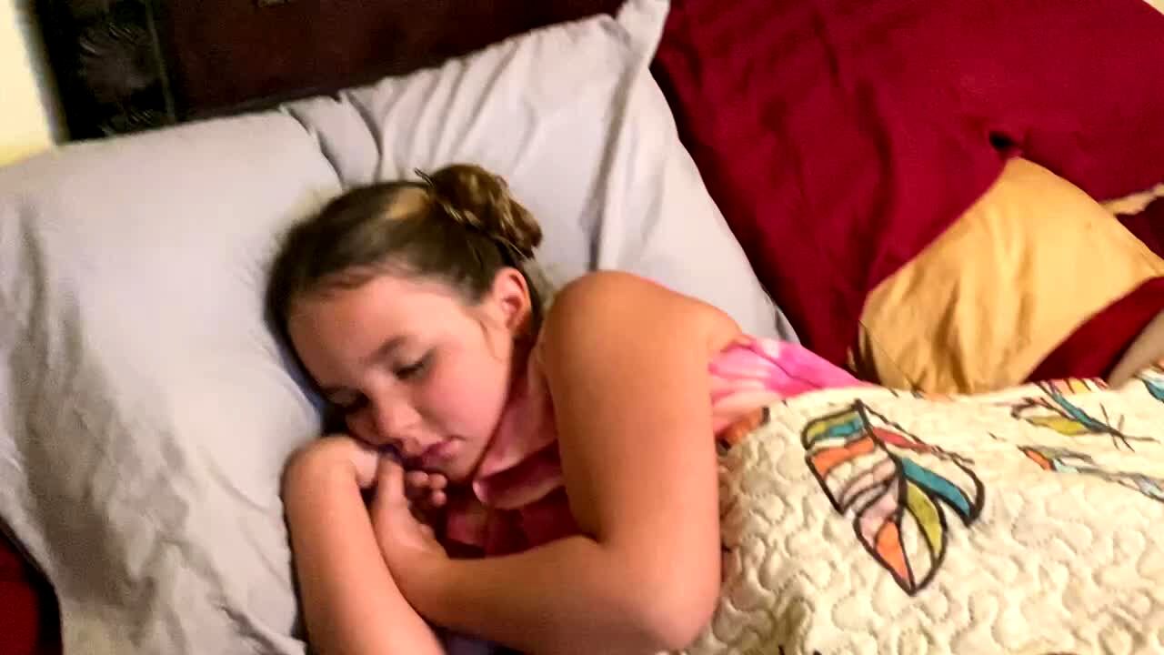 A woman wakes a young girl up in a bedroom and tells her that she has a phone call, then she gives her a water bottle, and the young girl throws the water bottle at her when she realizes that it is not a phone.