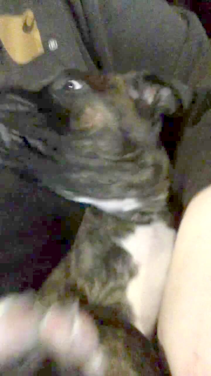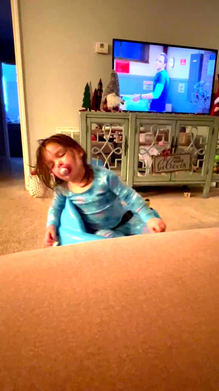 A bulldog stands on the floor of the living room and wobbles around for a moment and then thumps down to the floor and passes out.