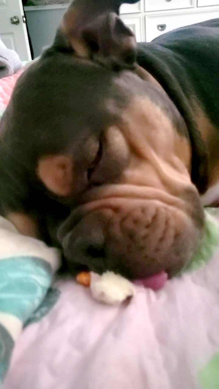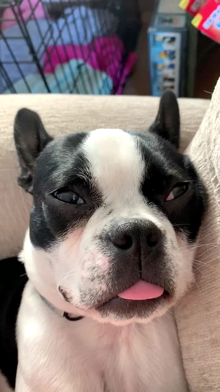 A Boston Terrier dog wiggles its face and rolls its eyes as it sleeps in the living room.