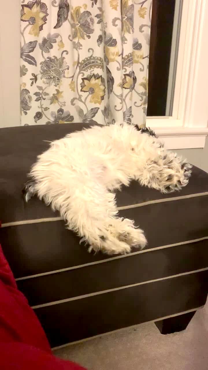 A dog lays on his back on a couch where his head is not seen then lifts its head up when his name, Tucker, is called.
