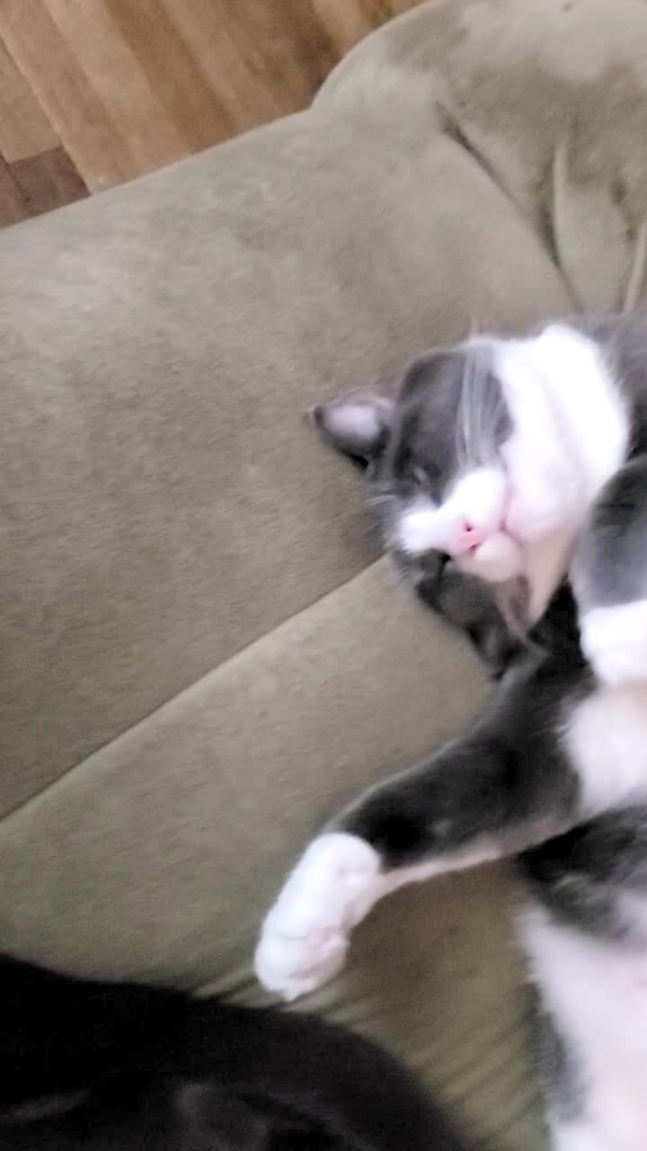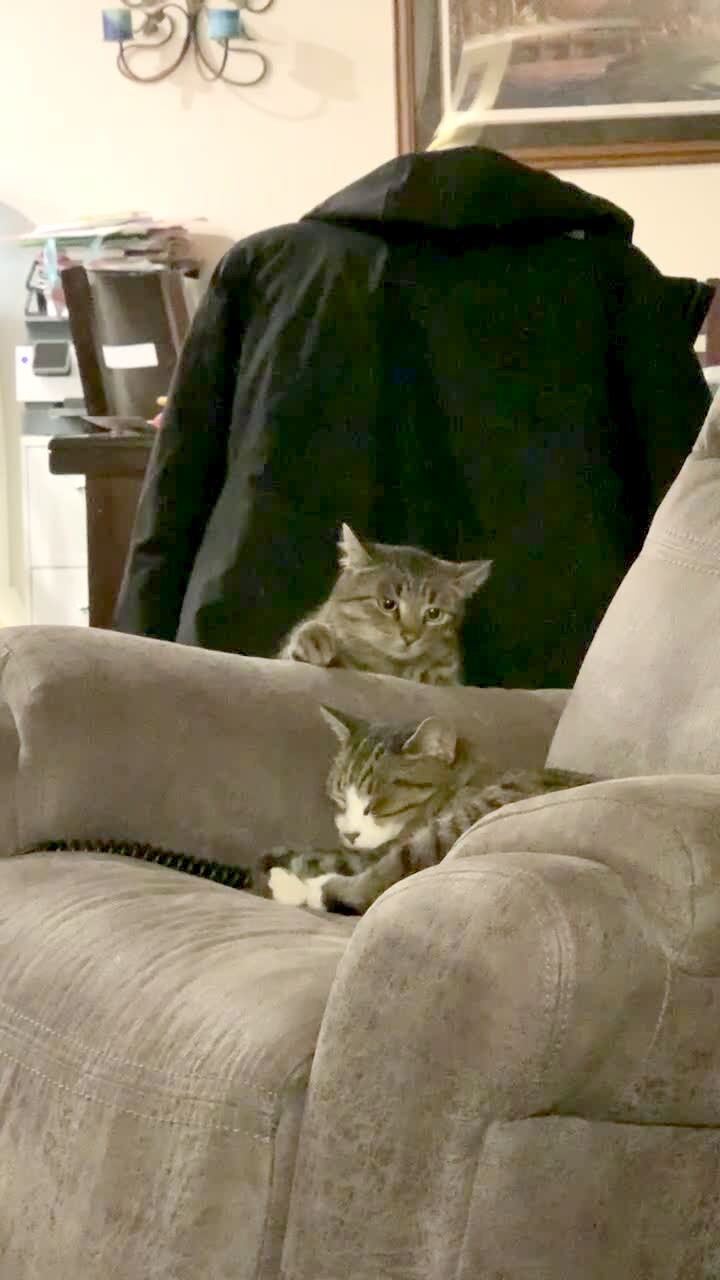 A cat sleeps on the couch and another cat peeks over the edge. The sleeping cat wakes up, and the other cat slowly dips back down and out of sight.