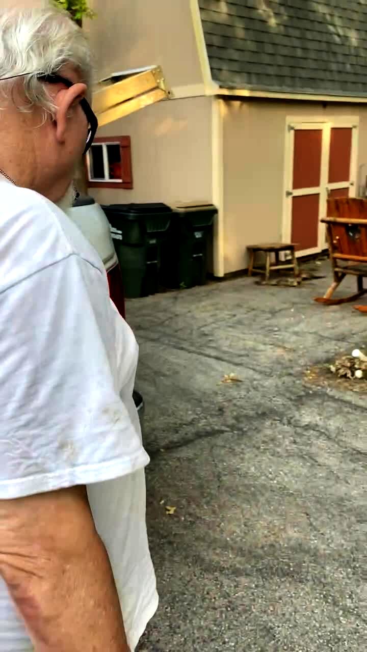 A woman walks down a driveway where a man sleeps in a car with the door open, then she yells his name, and he falls out of the car.