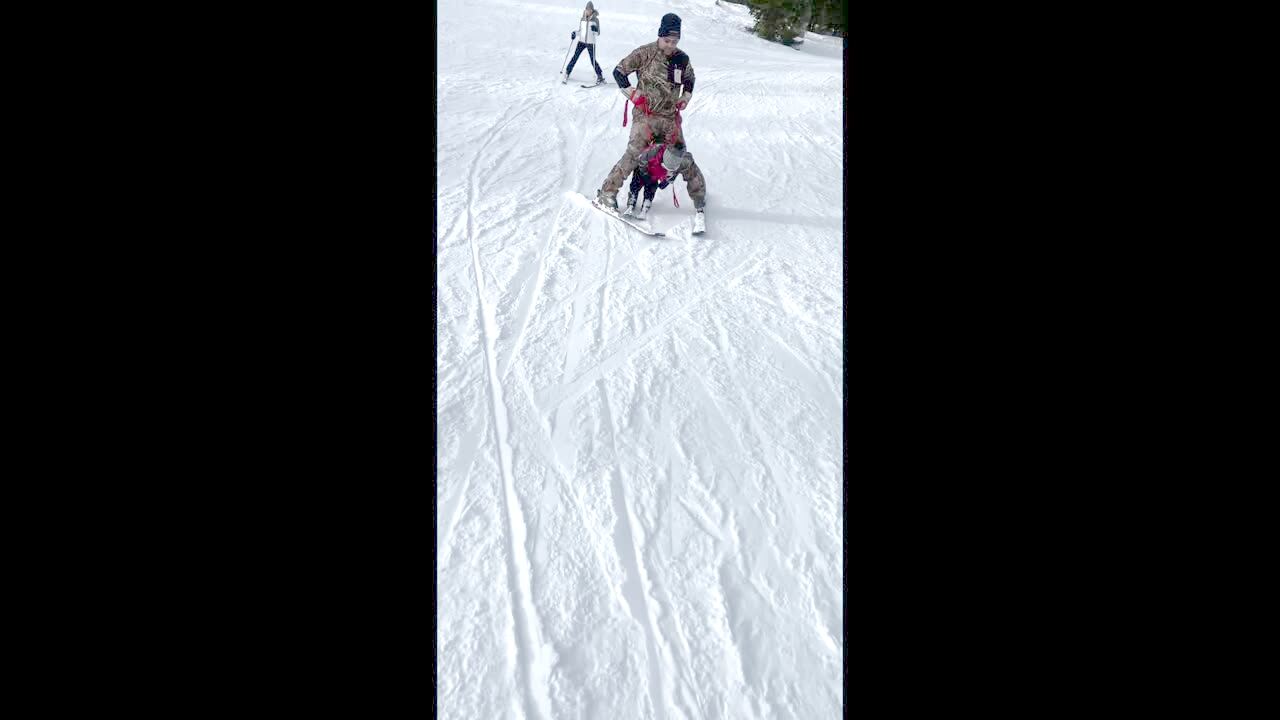 A man skis down a snowy mountain with a tot boy, and the boy falls asleep as the man holds him up. The boy then lies asleep in the snow as the man cleans up the ski gear. Multiple clips edited together.