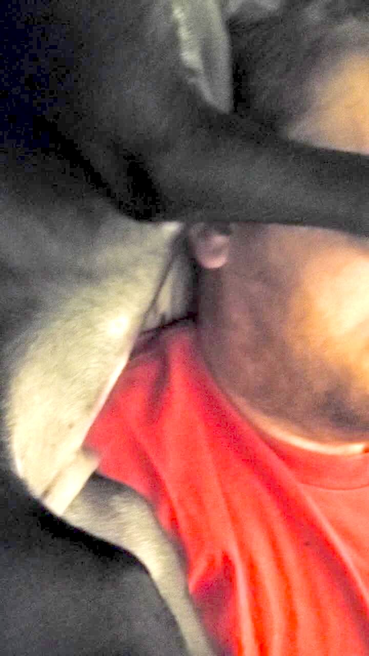 A man snores as a dog sleeps next to him and rests his paw on the man's face and head.