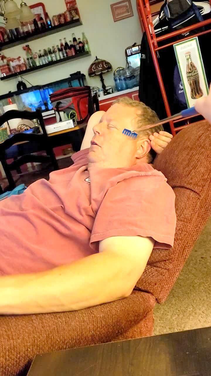 A woman in the living room touches a man's forehead with a backscratcher as he sleeps. He hits himself in the forehead waking himself up.