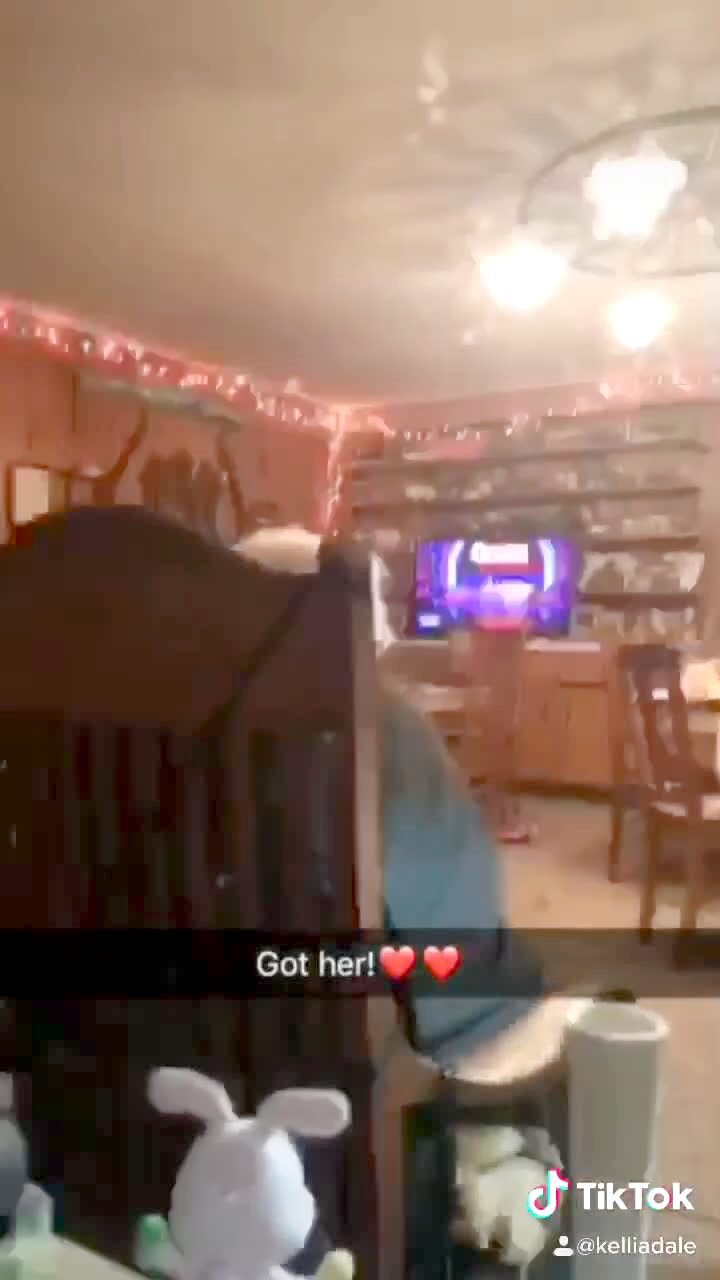 A young girl does a filter quiz and a dog barfs on her in the living room. TikTok video.