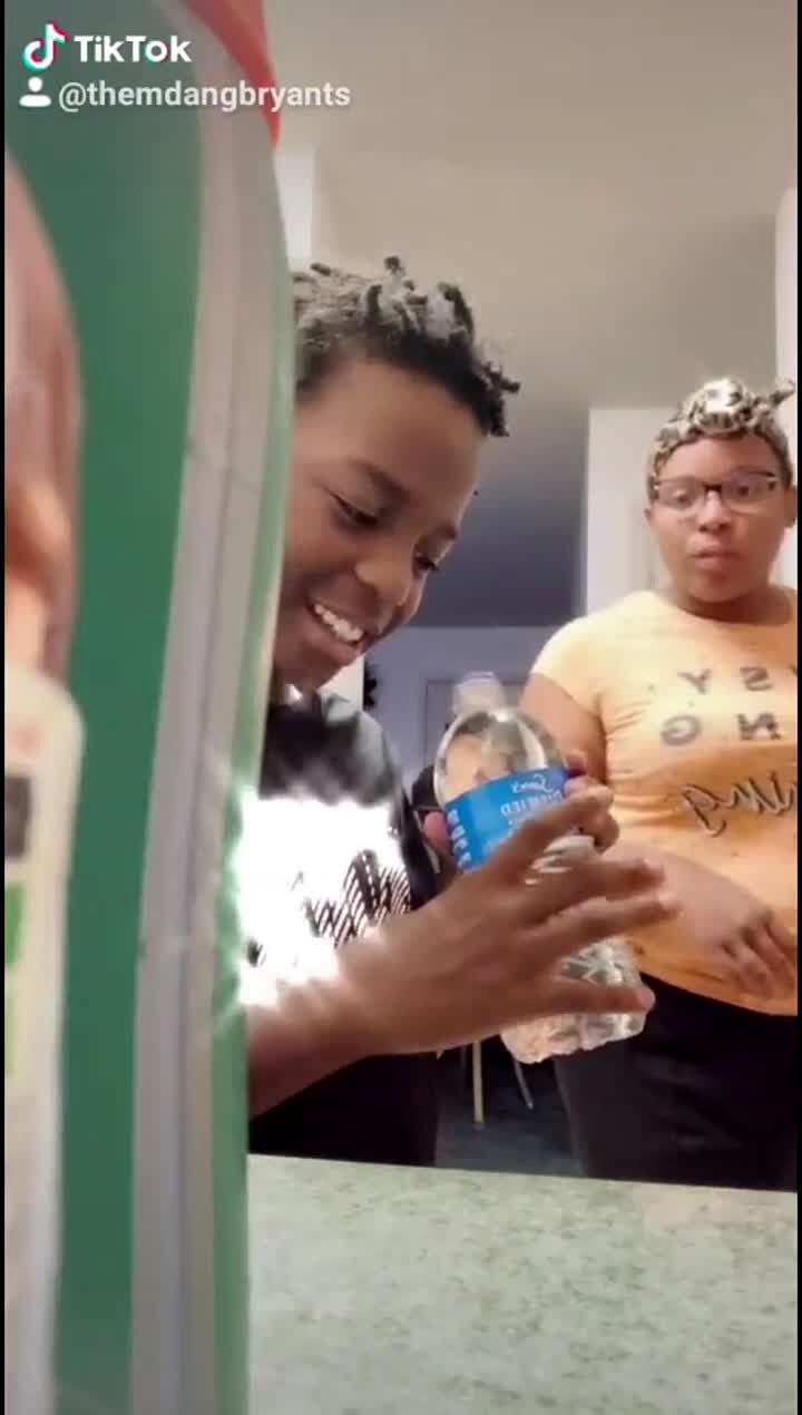 A young boy tells his mom to look into his water bottle because there is something in it. She looks and he squirts the water into her face. She screams and chases him. Tiktok video.