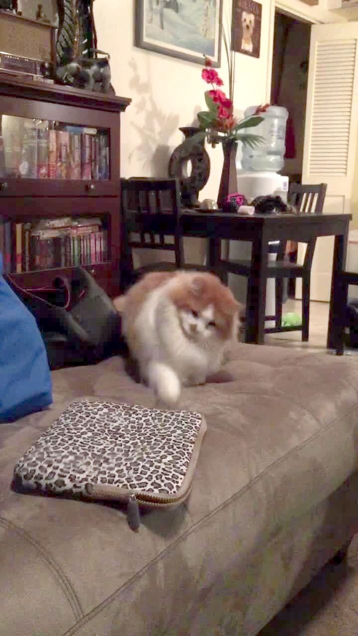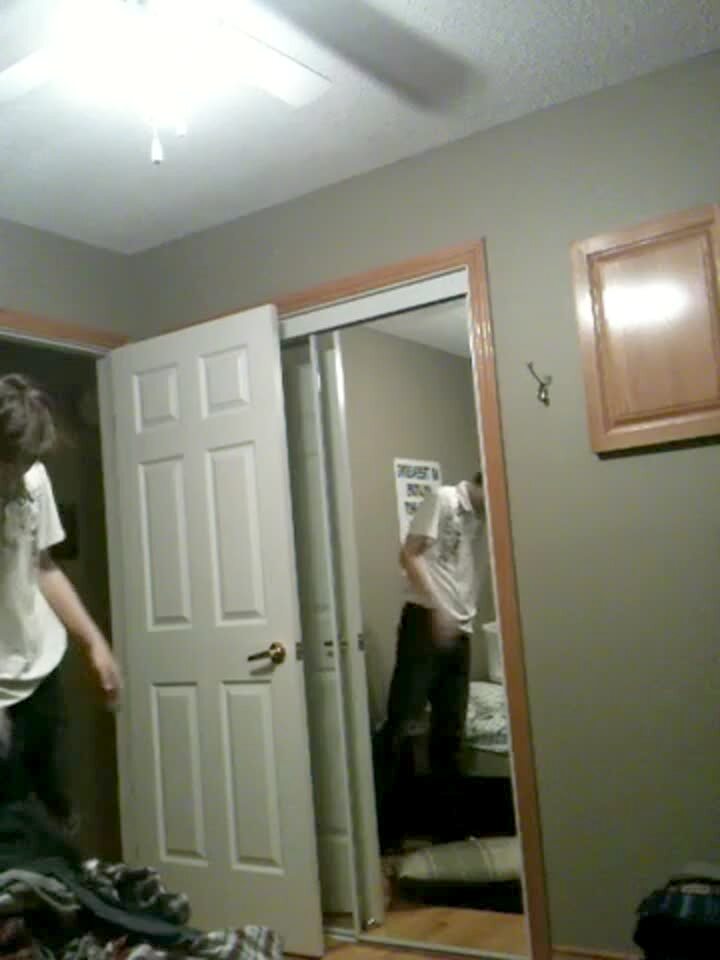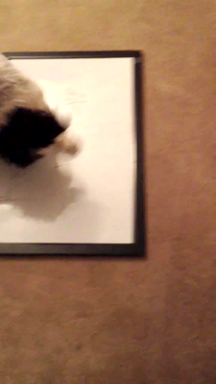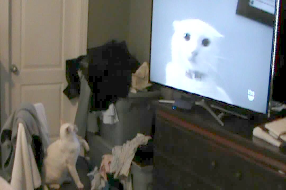 "Hairless Cat-Astophe" A hairless Sphinx cat balances on top of a free standing mirror in a closet indoors and jumps off at 1:00:00, causing the mirror to fall down, revealing the cat hanging off the side of a hamper. He climbs into the hamper and balances on top of it.