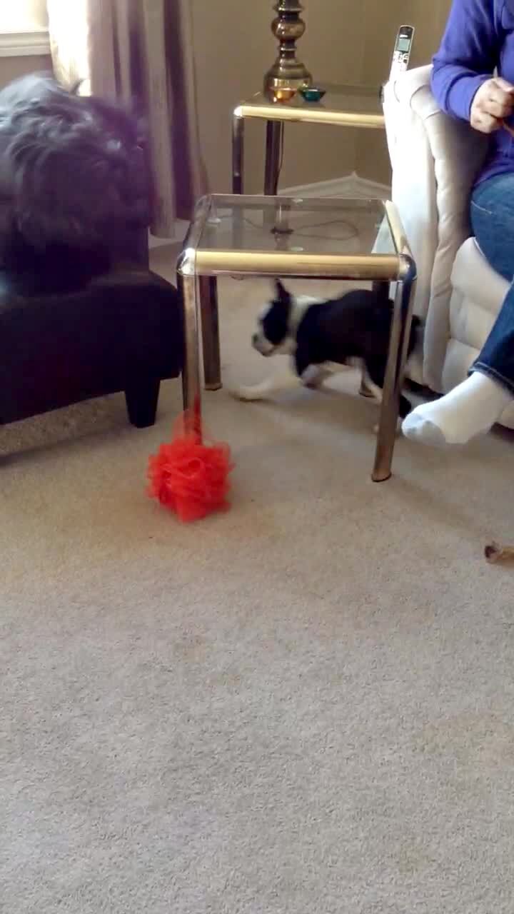 A large lab dog steals a bone from a terrier dog when the smaller dog looks away. The terrier dog turns around and looks around in confusion.