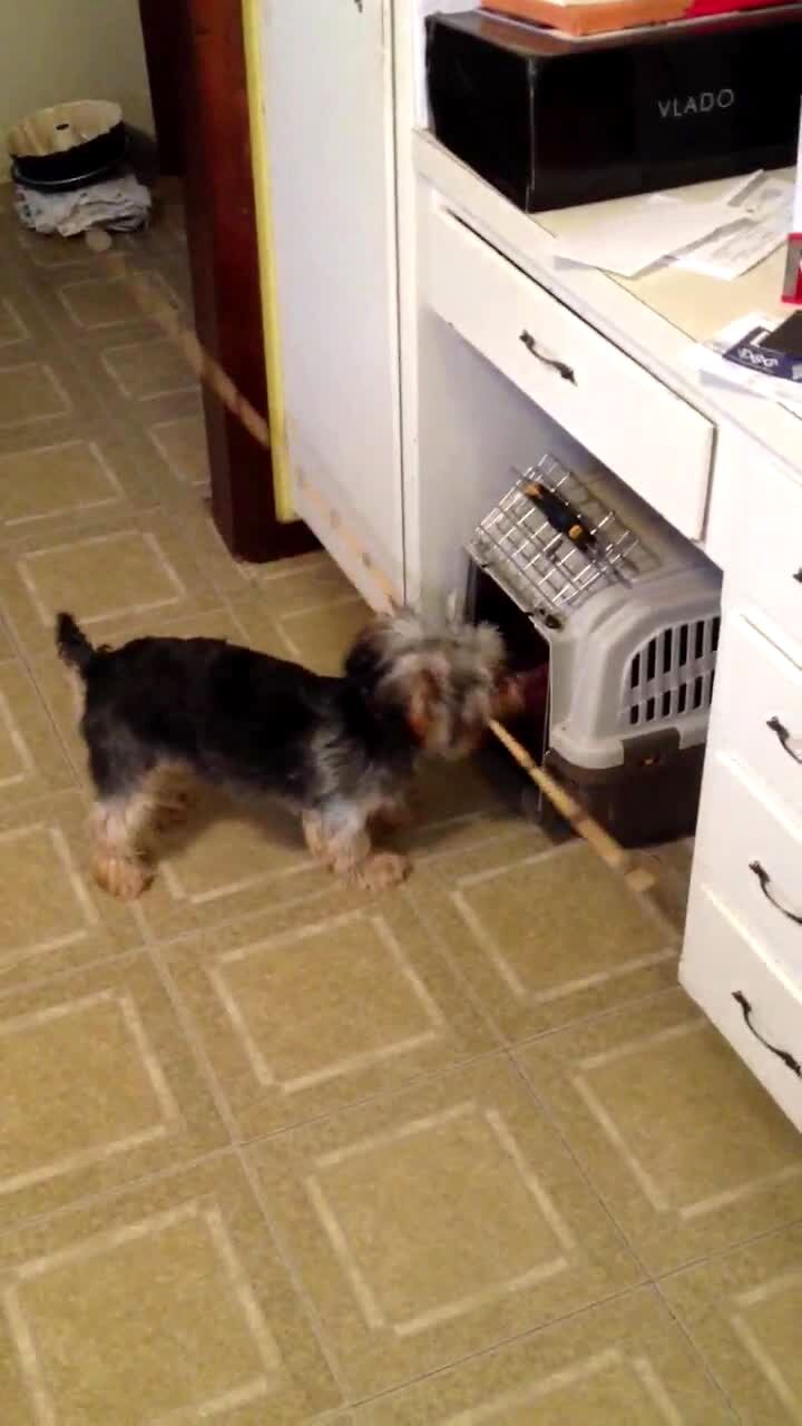 A Chihuahua dog climbs a chain length fence outdoors. Action at :22.