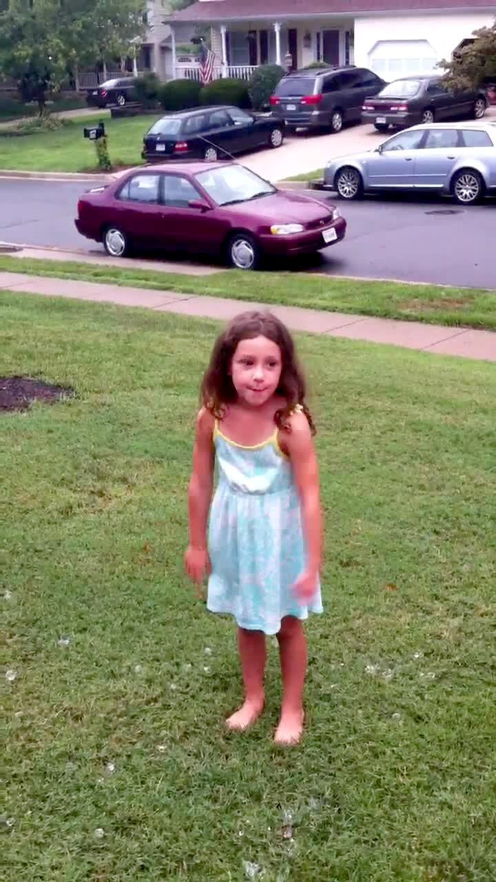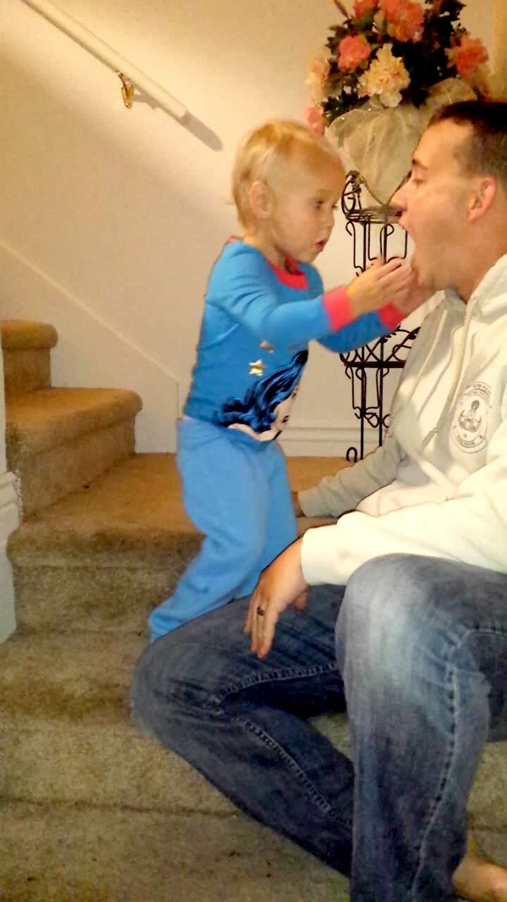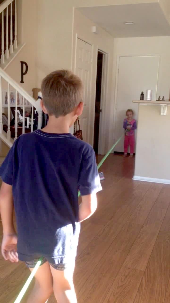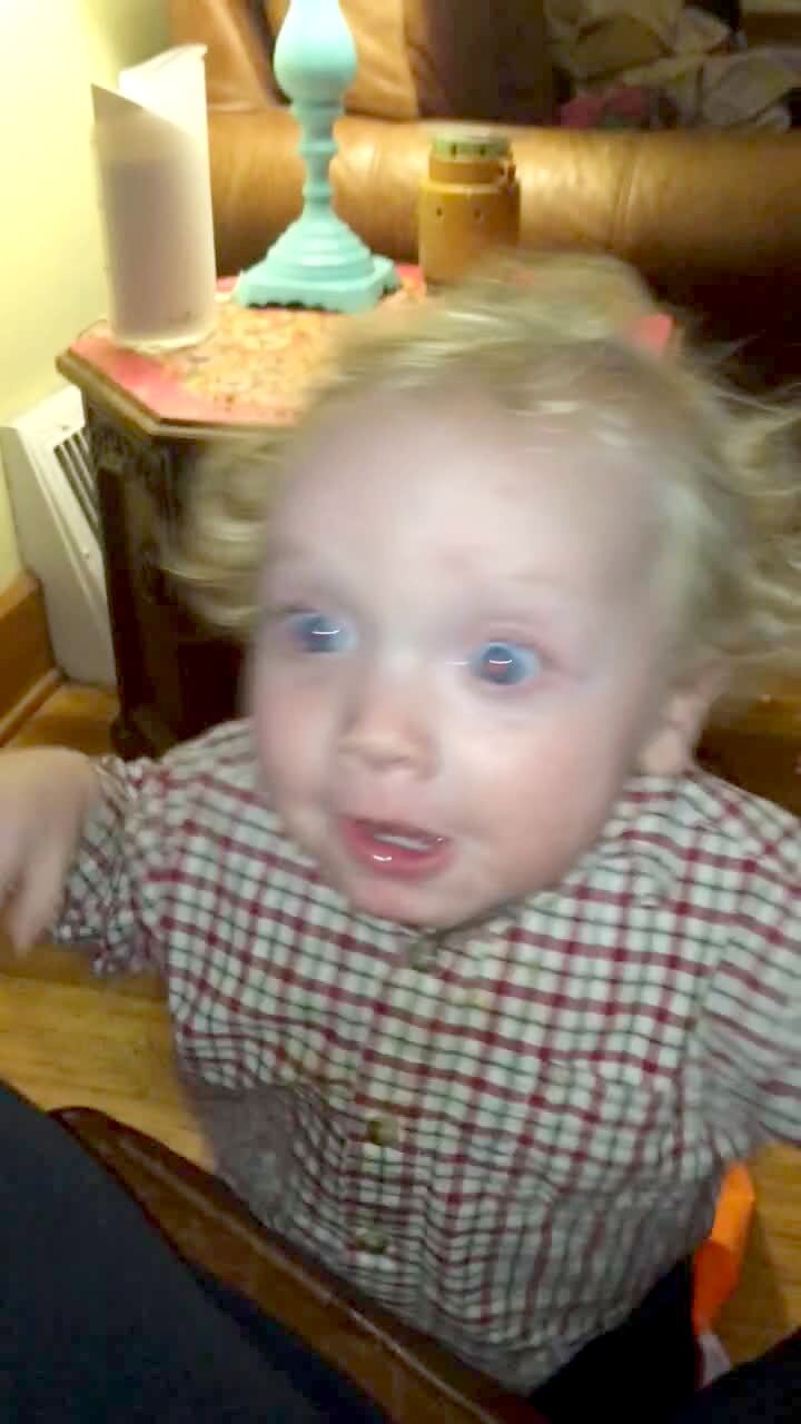 A tot baby boy and his sister jump around excitedly while their mom aims a hair blow dryer at them indoors. Funny faces.