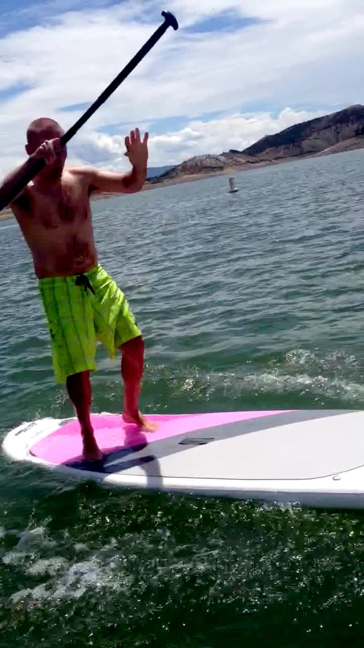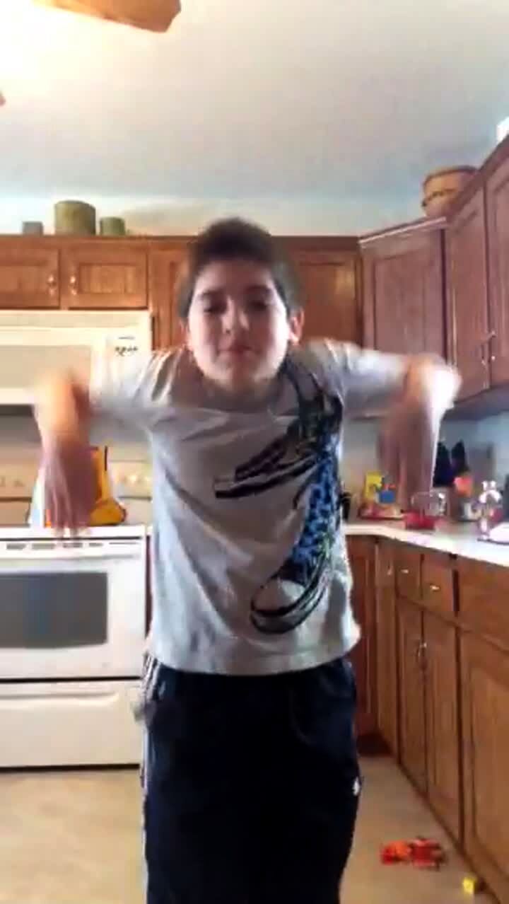 A shirtless boy dances for the camera.