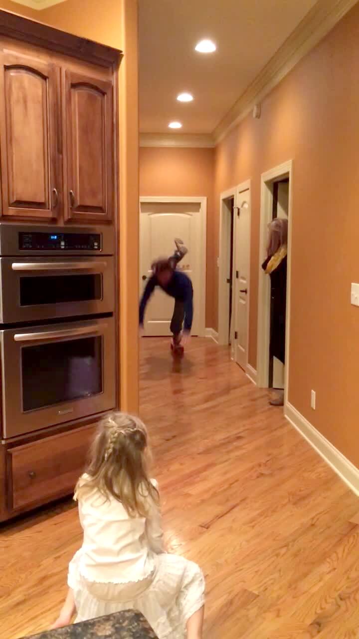 A Husky dog leaps back and forth between two rooms at home, jumping over the hardwood hallway.