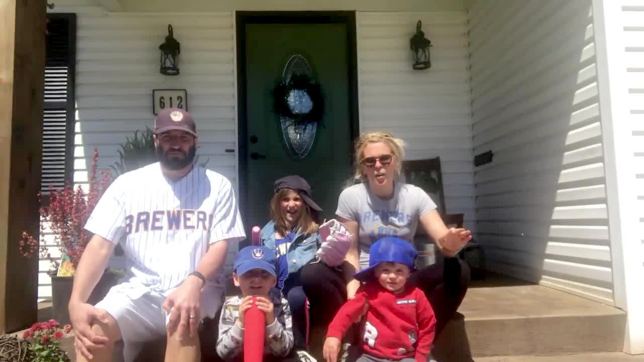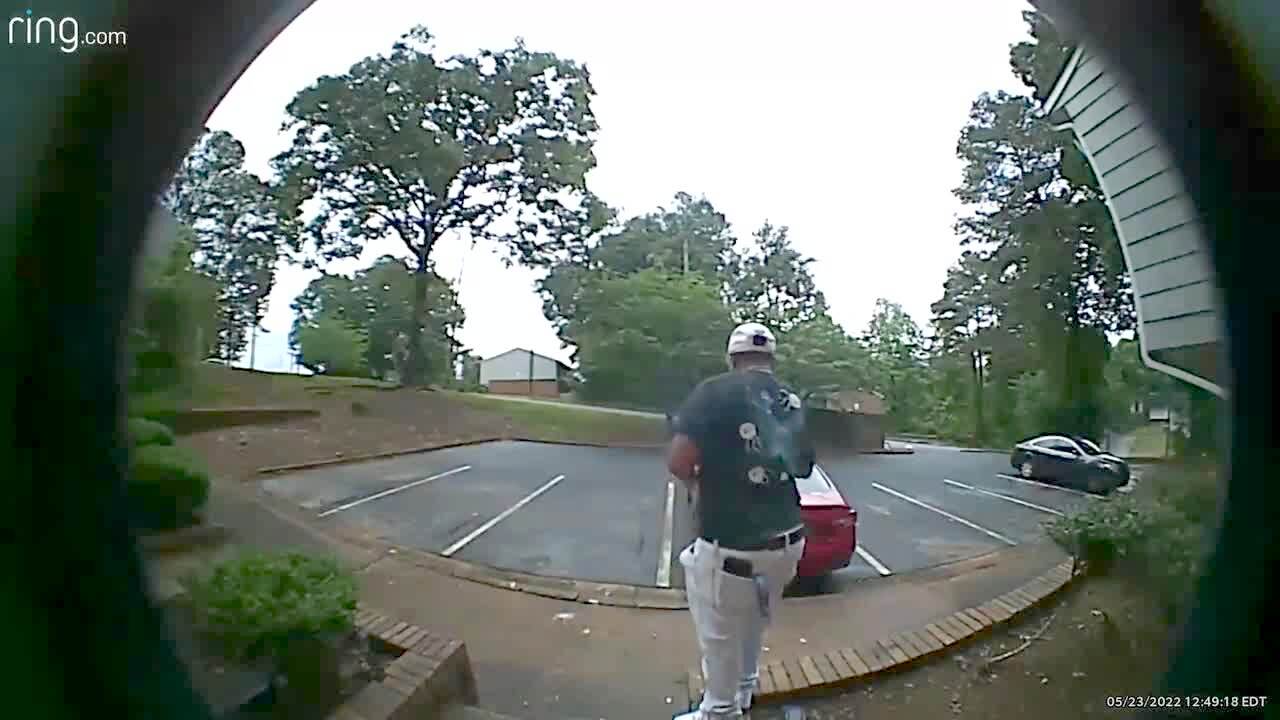 A skeleton decoration sits in a chair on a porch and wind blows it and it moves it and it looks like it stands up by itself. Doorbell security camera.