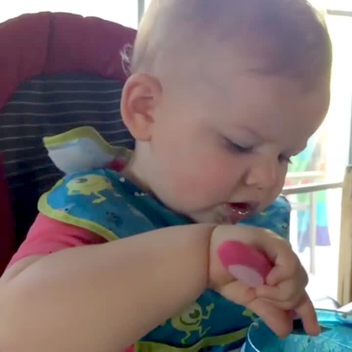 A baby boy gets a piece of food stuck in his upper lip, which makes it look as if he has Buck Teeth.