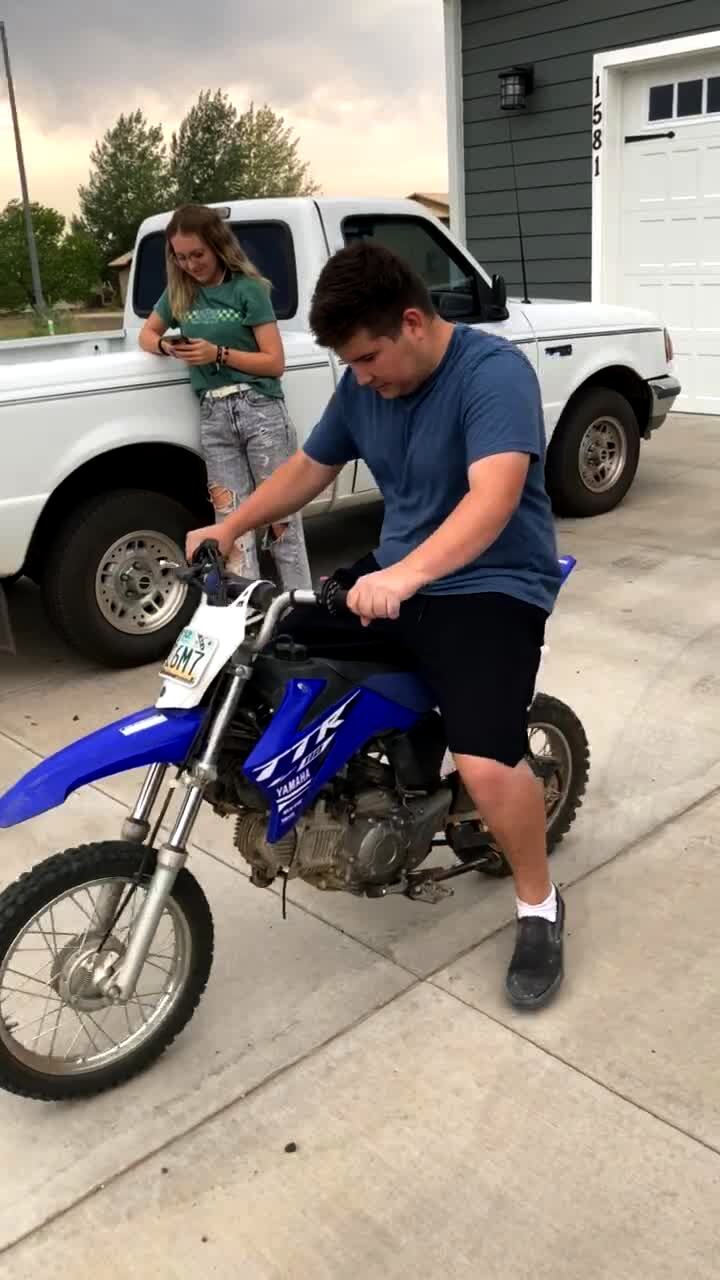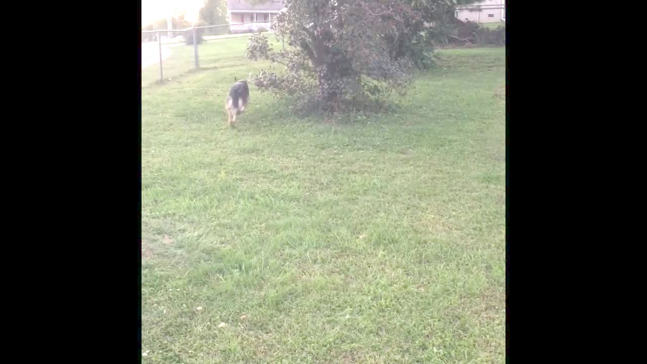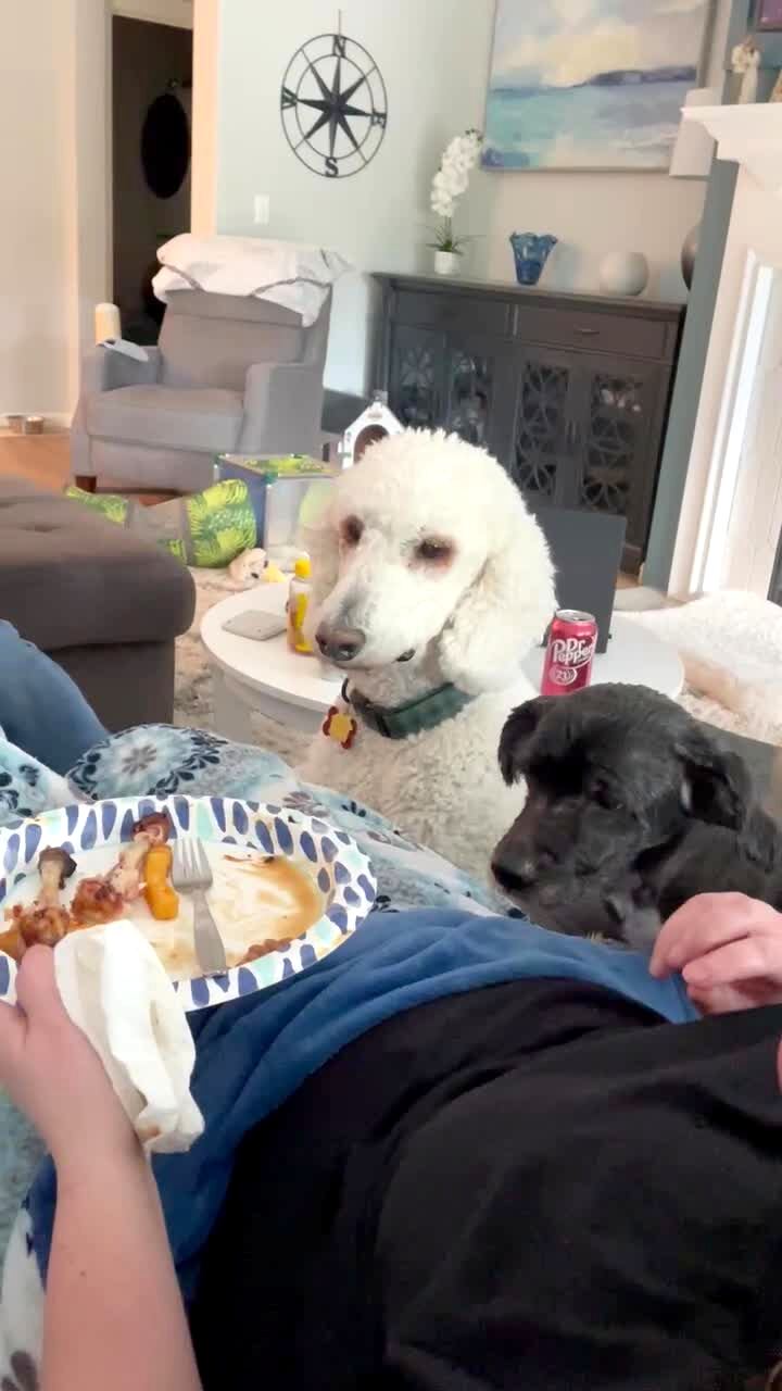 Two dogs roll over in unison as a woman laughs outdoors. Social media video.