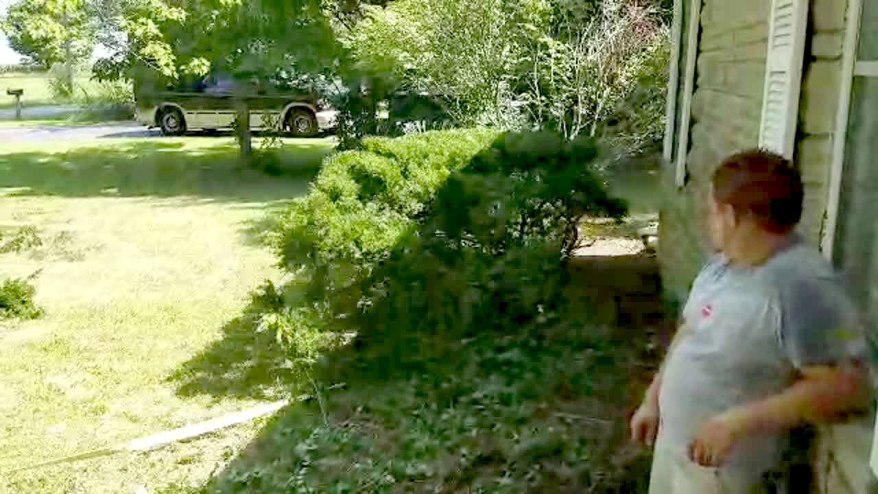 An umbrella gets carried off a table by wind and flies away in a yard. Security camera footage.