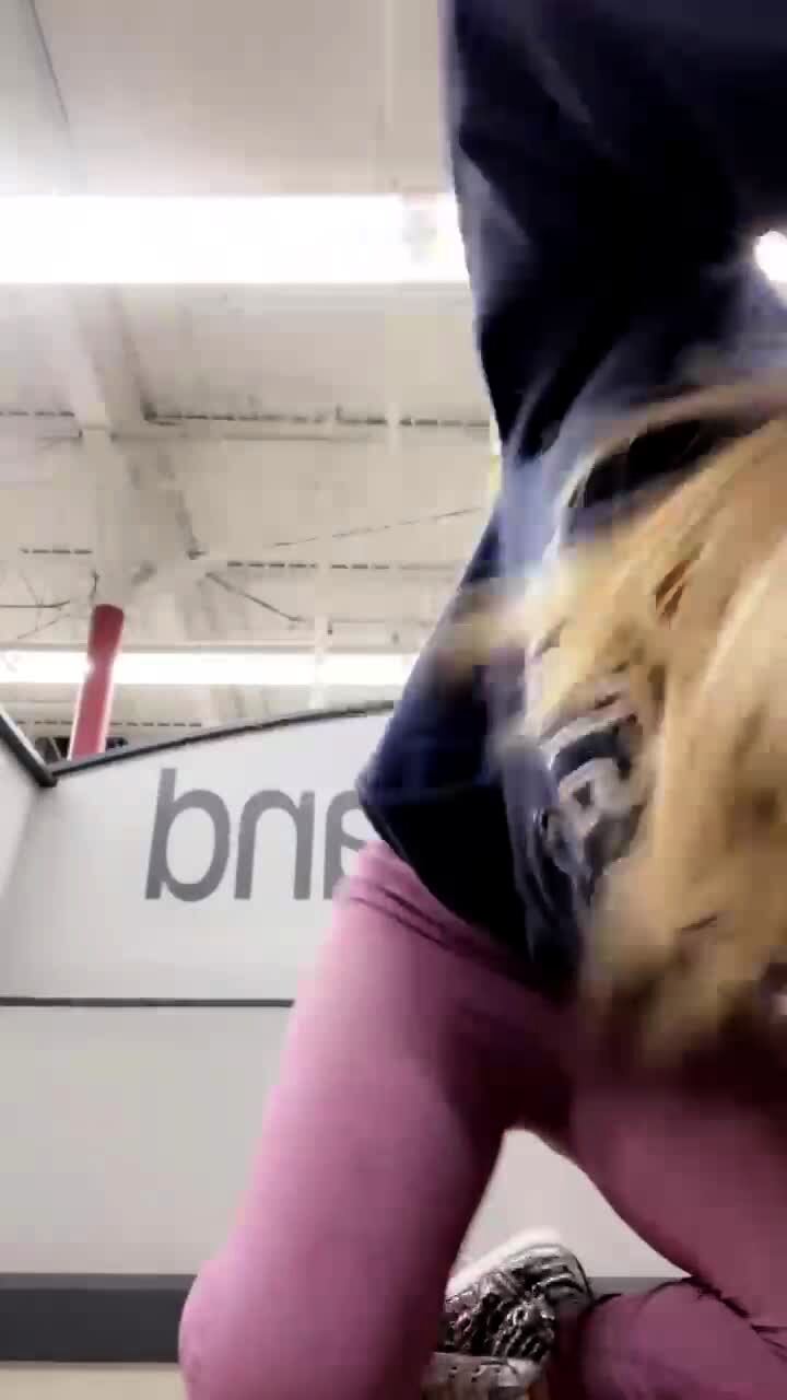 A woman pushes a shopping cart and a tot boy lies on the floor behind it and holds on and is dragged through the store.