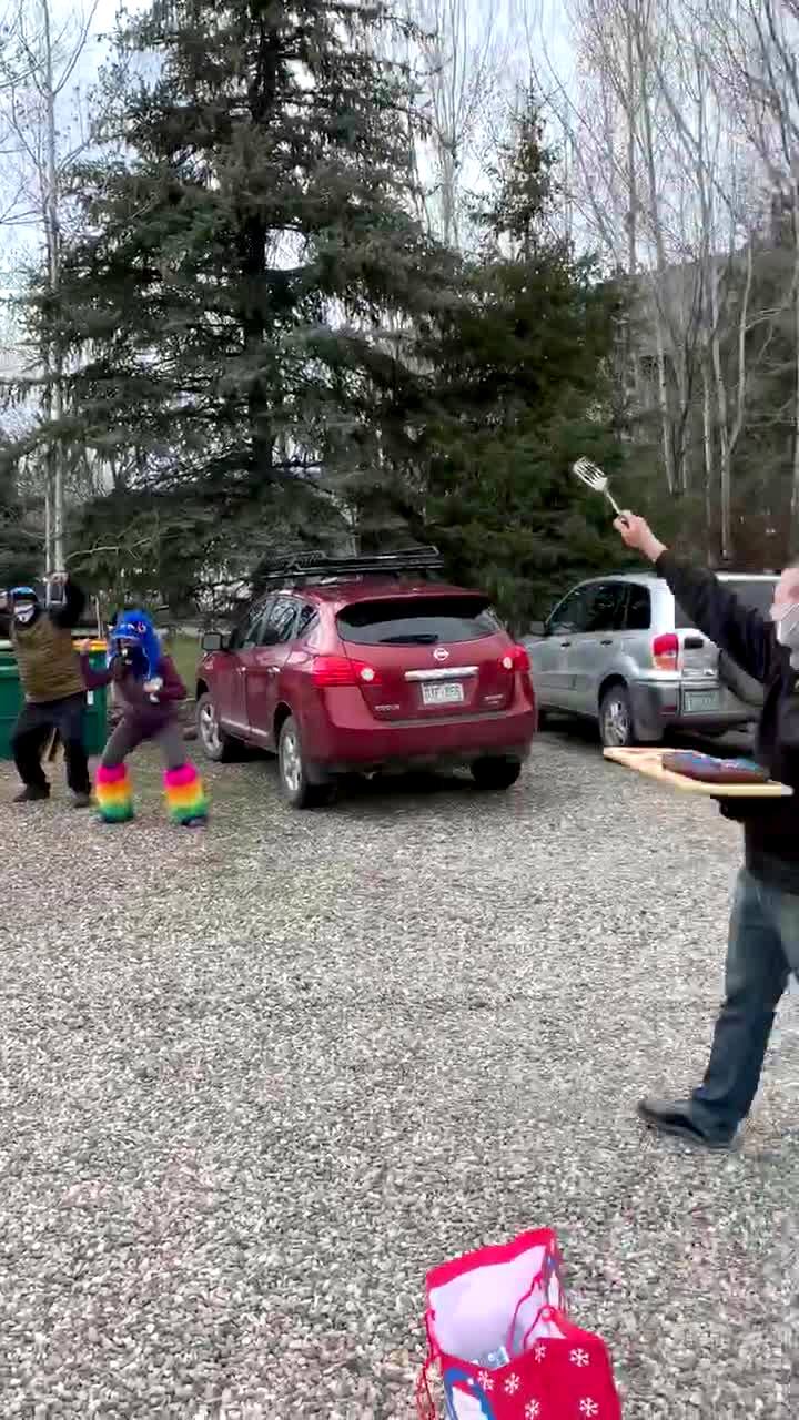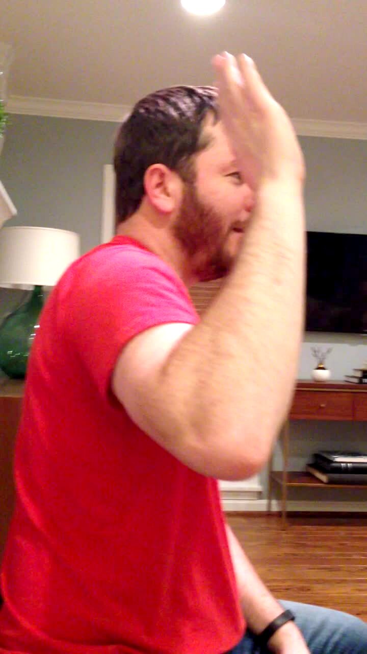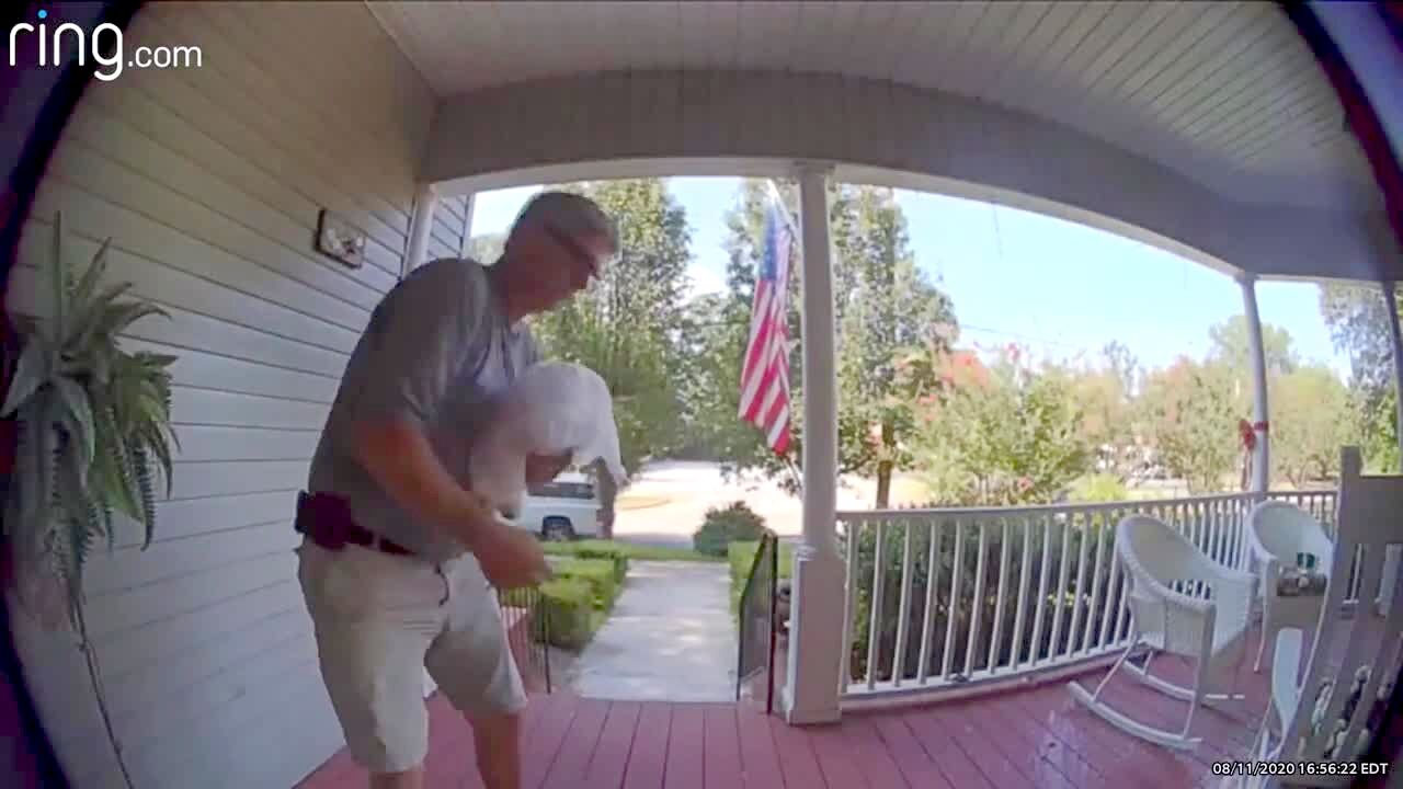 A man on anesthesia scoots his body up the driveway and says "I'm walking on water, it's a miracle" and thinks he sees a shark. His wife tries to help him stand up, but he does not move and then continues to scoot.