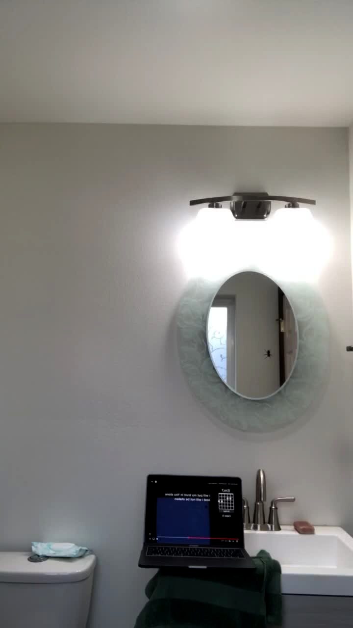 A woman brushes her teeth in the bathroom with a bird on her toothbrush.