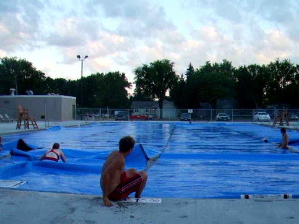 A man tries to jump into a pond and sinks into soft mud.