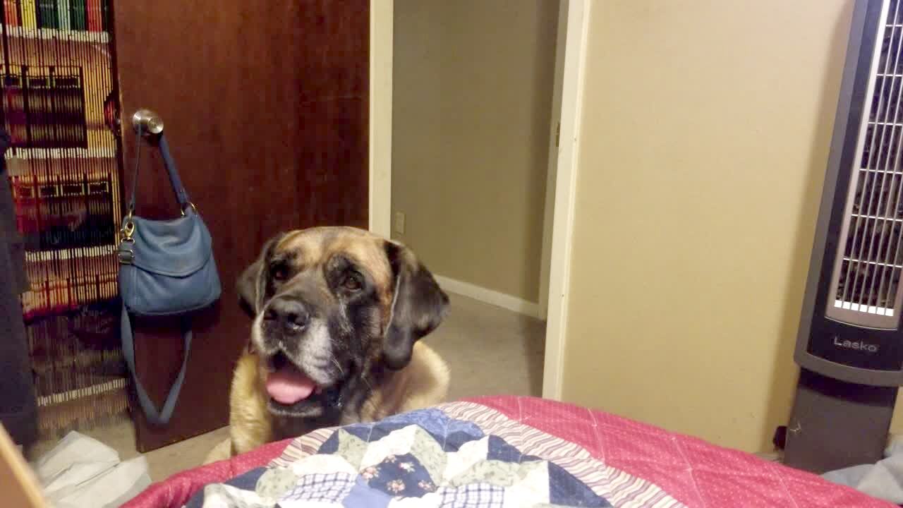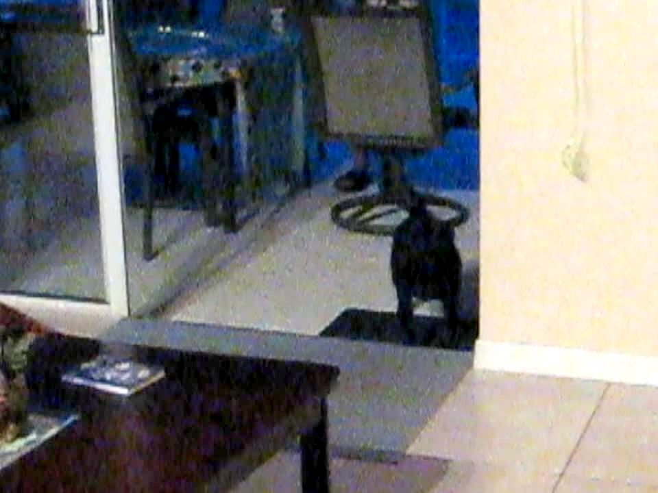 A woman tells her German Shepherd dog to get off the kitchen counter, then turns the camera to her cat and asks if it made the dog jump on the counter.