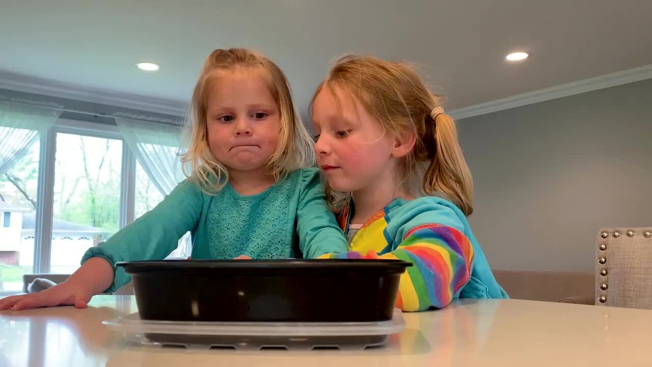 A girl squeezes a glue bottle, and it explodes on her head.