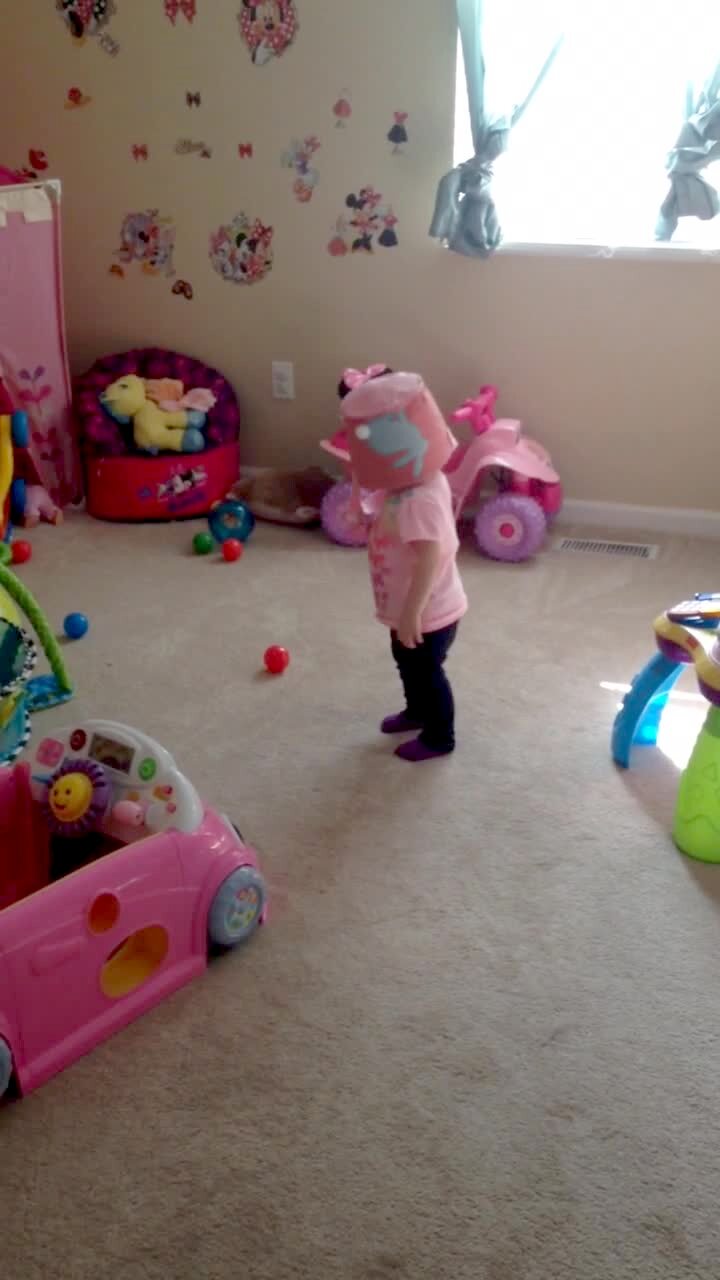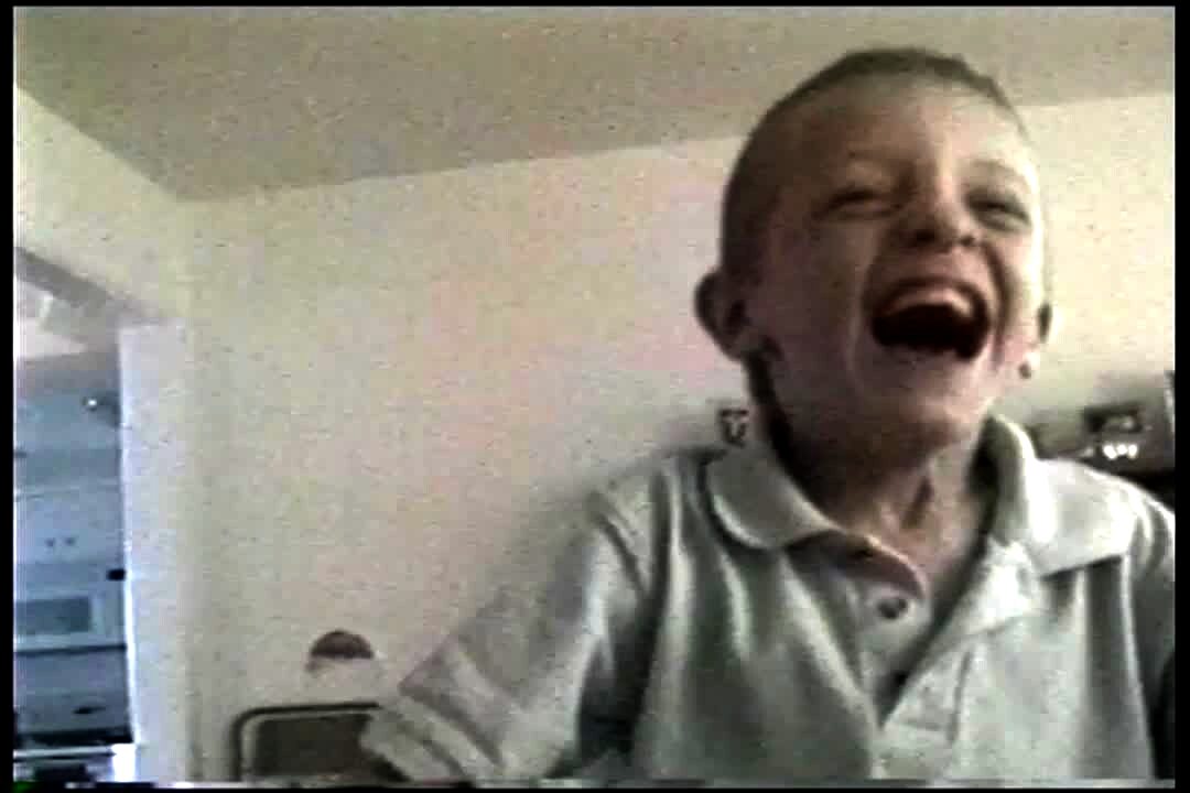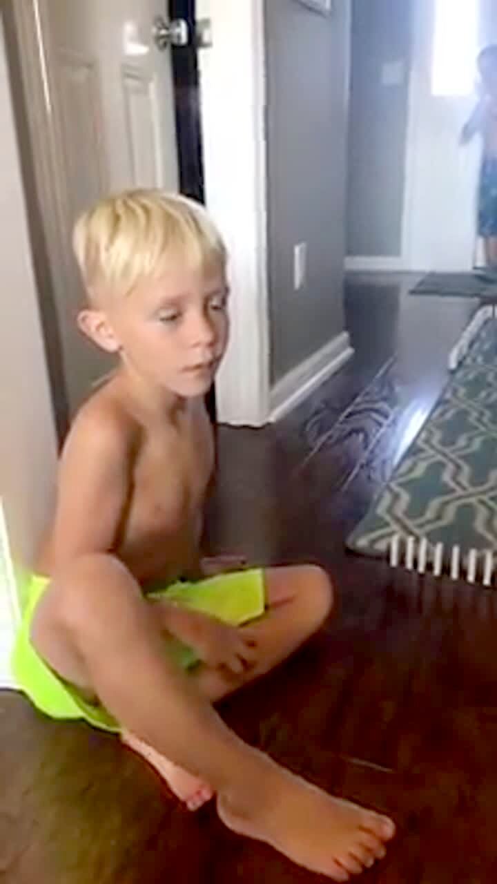 A young boy stacks a bin on top of 3 other bins then pushes it over and two children come out of the bins.