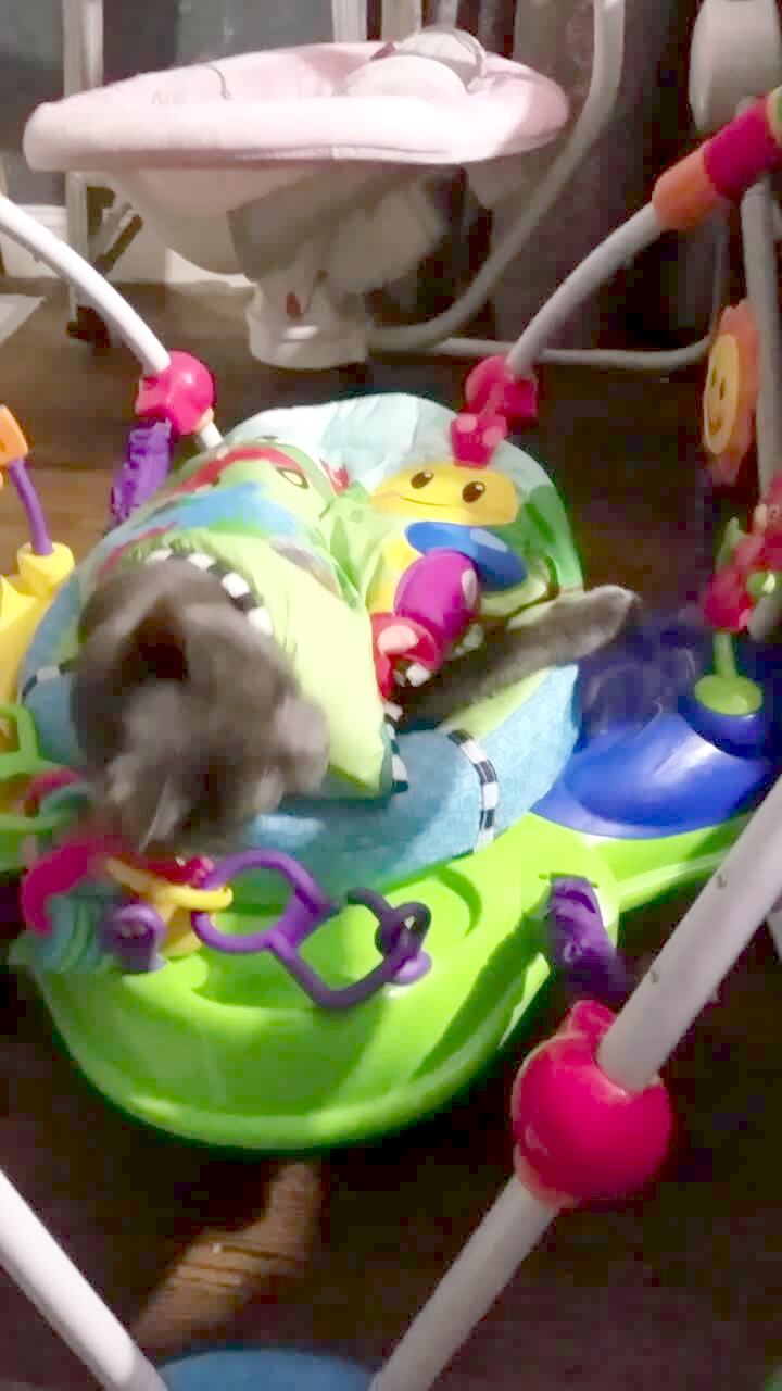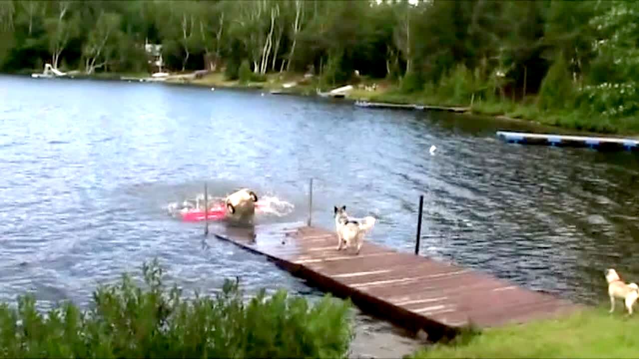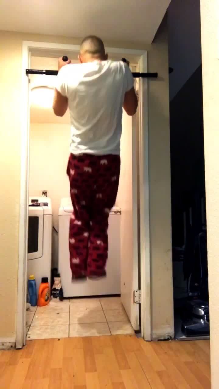 A pug dog jumps for a treat repeatedly in slow motion indoors.
