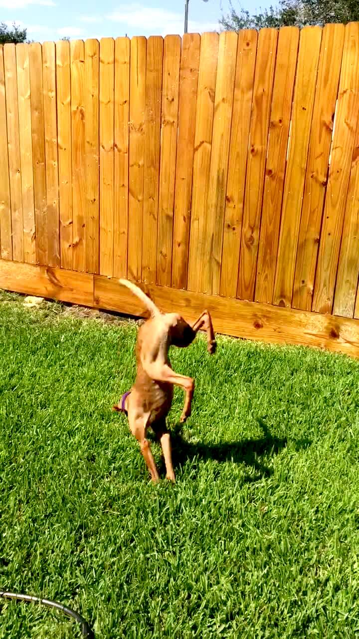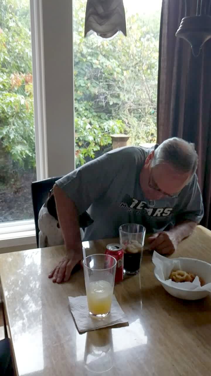 A dog chews on its tongue and growls when the camera holder puts their hand on the dogs head and pushes it around.