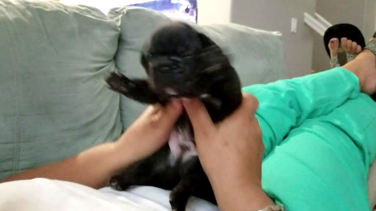 A woman pulls a blanket off her dog indoors and static from the blanket makes the dog's hair on his ears stand straight up.