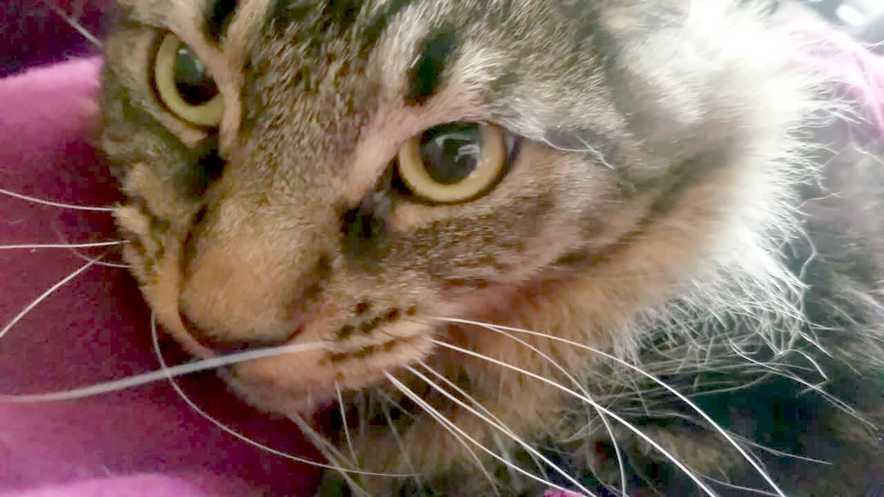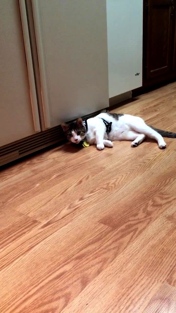 A tortoise crawls on a cat but doesn't get anywhere because his feet slip through the fur.