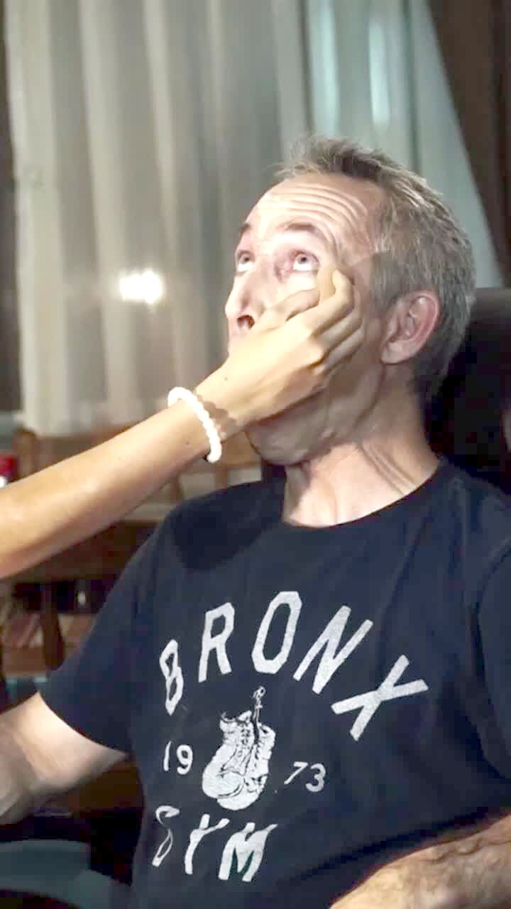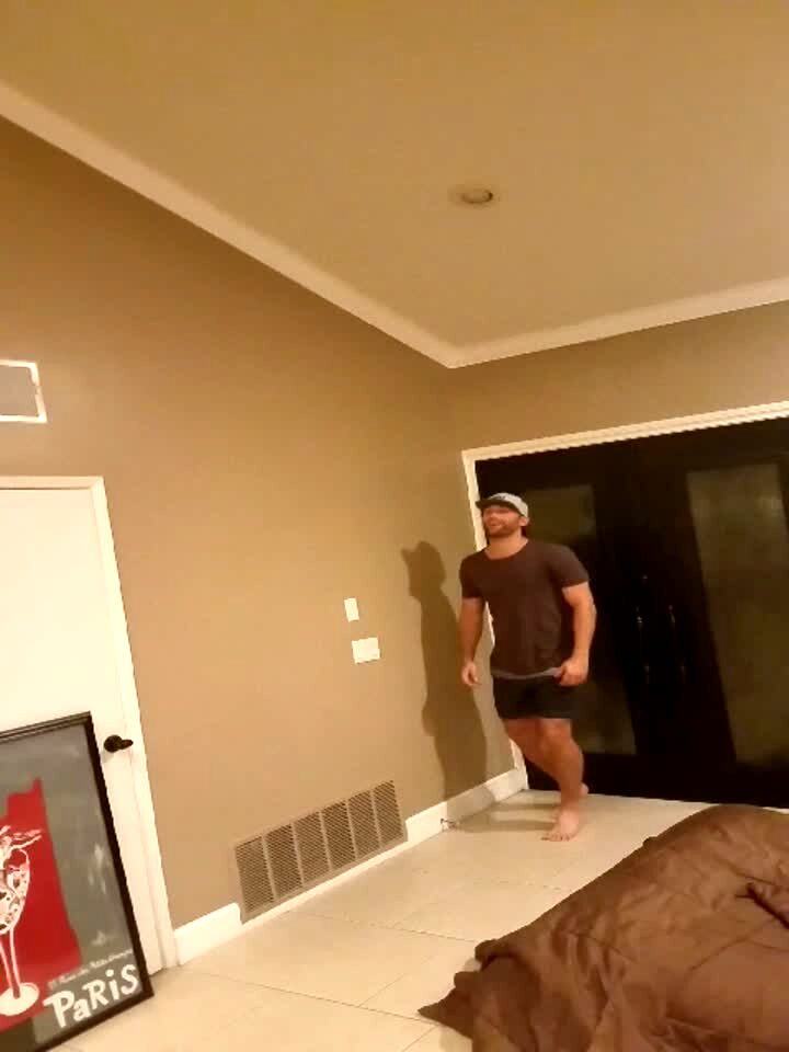 A cat leans on a man's stomach indoors as the man puffs his stomach in and out to make it look as though the cat is giving him CPR.