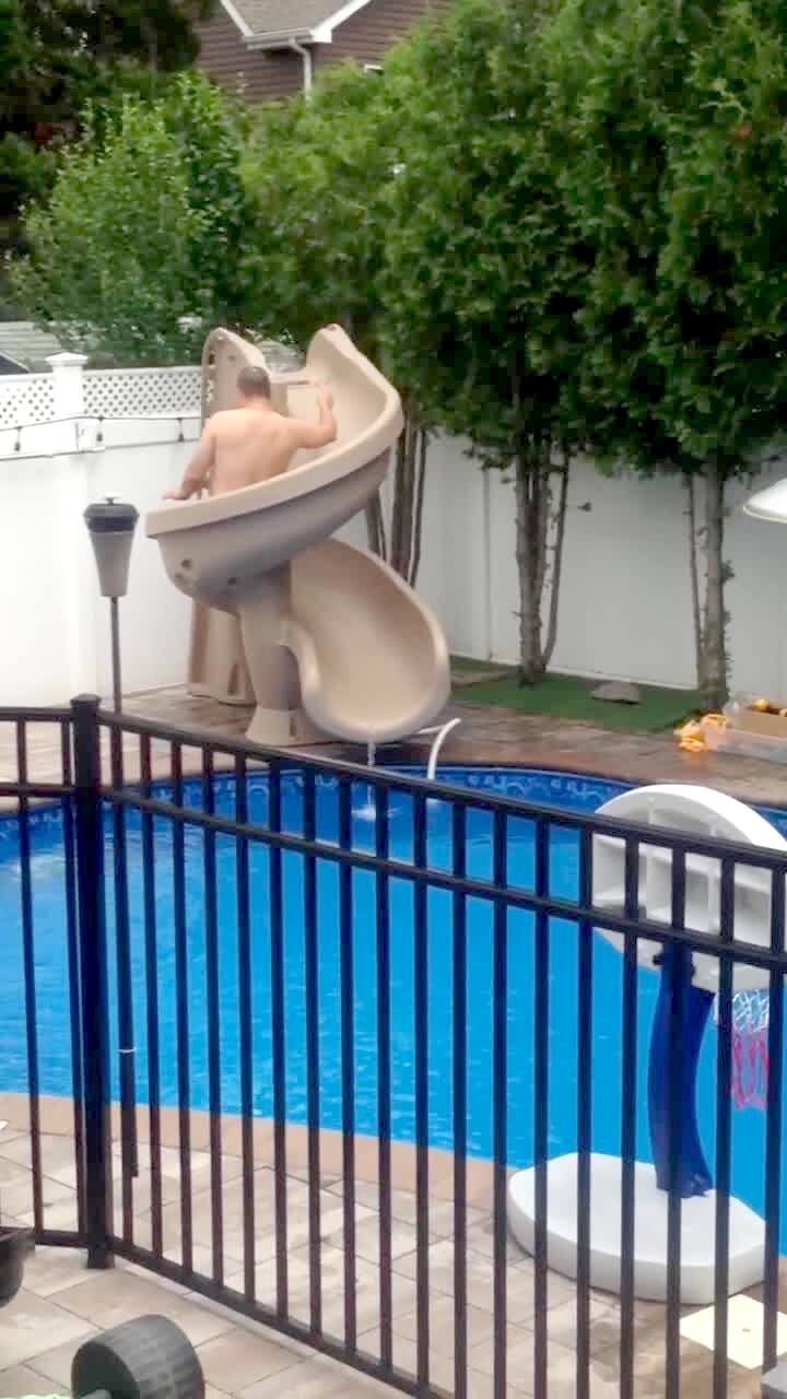 A man sleds through the snow in a swimsuit and sneakers and holds up milk and bread as he screams "I got the bread and milk!" repeatedly outdoors. Vine/Instagram.