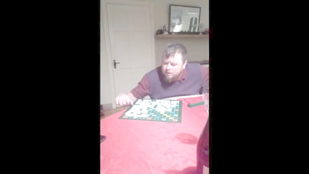 An English Bulldog dog makes a strange noise repeatedly as he whines on the floor indoors.