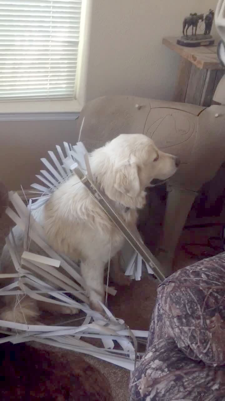 A dog that looks like a mop sits beside a "Caution Wet Floor" sign before a knock is heard at the door and the dog gets up and walks away.
