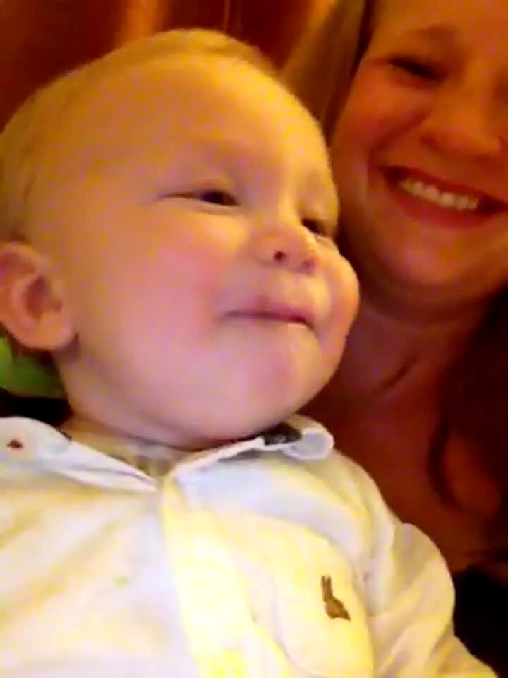 A toy truck tows a baby boy in his booster seat across the floor at home. Vine/Instagram.