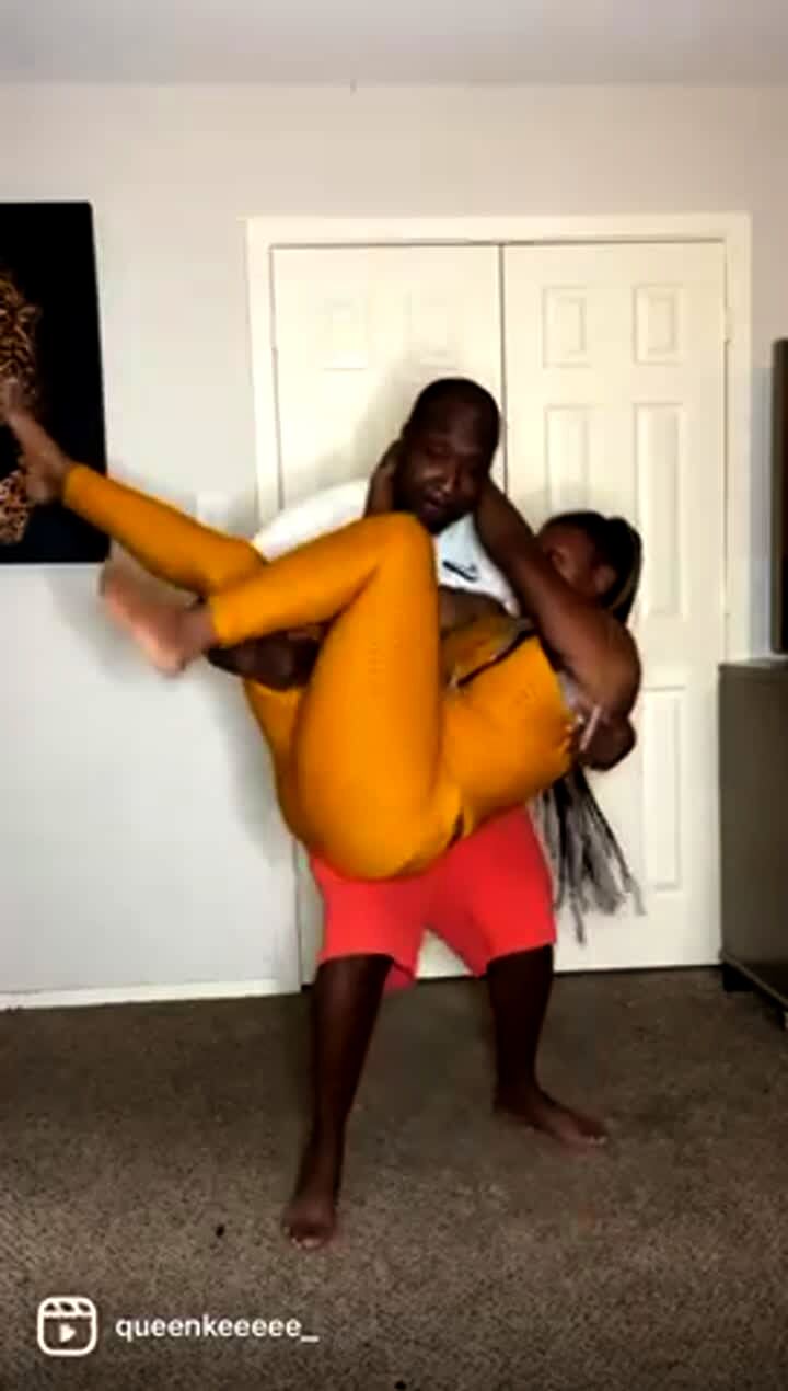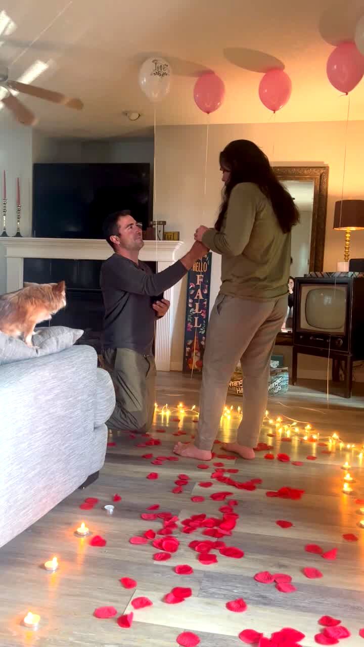 A woman slowly sets up a row of dominoes on a coffee table in a living room. Around 2:20 she tells him to tap over the first domino and he smashes them all over.