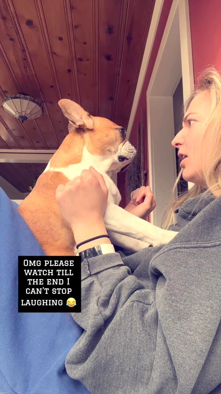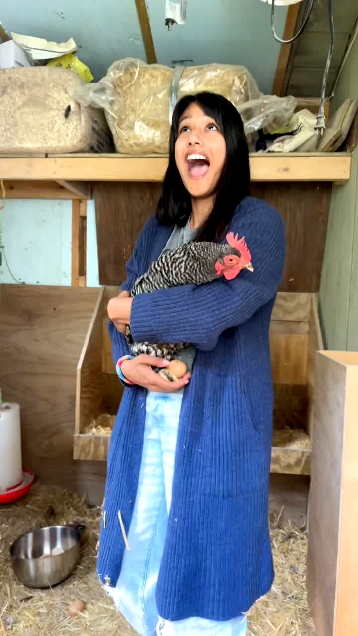 A teen girl pretends to be a scientist for the camera and touches a praying mantis and it scares her and she screams inside a house.