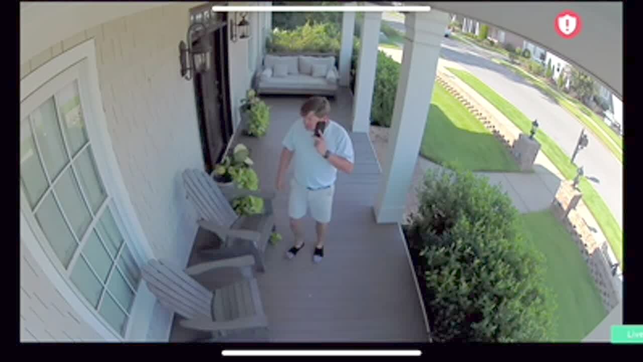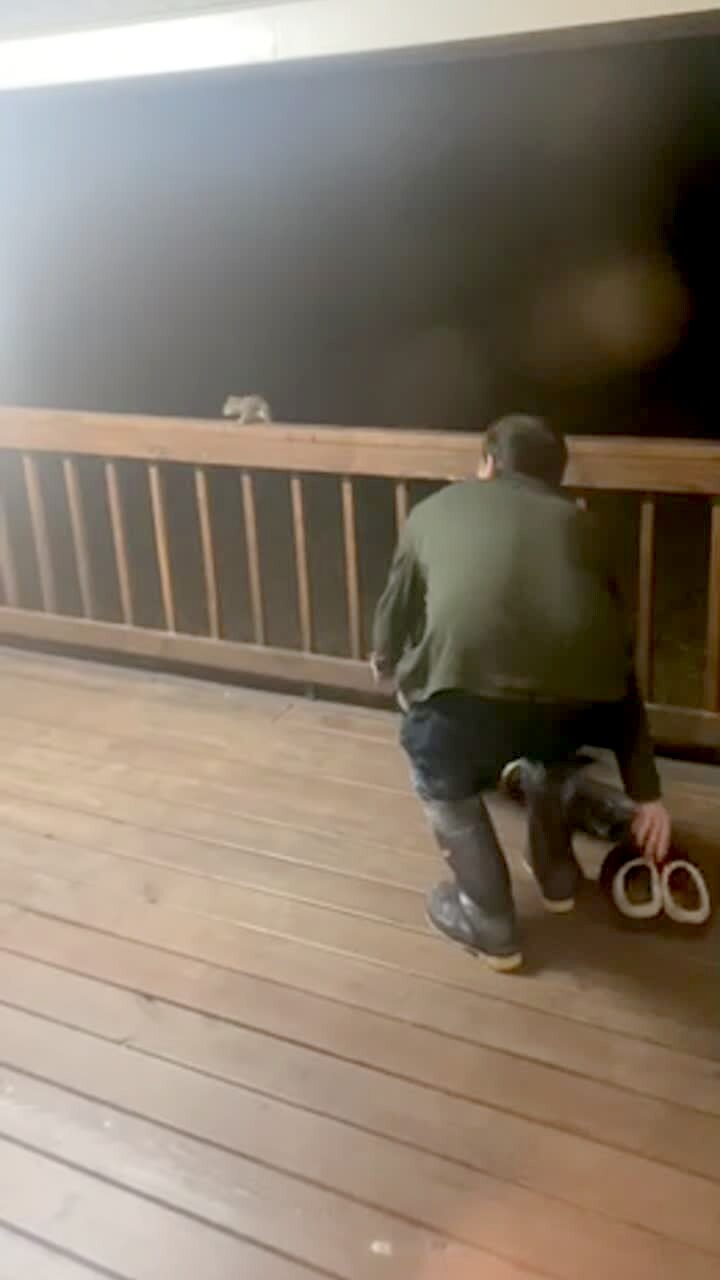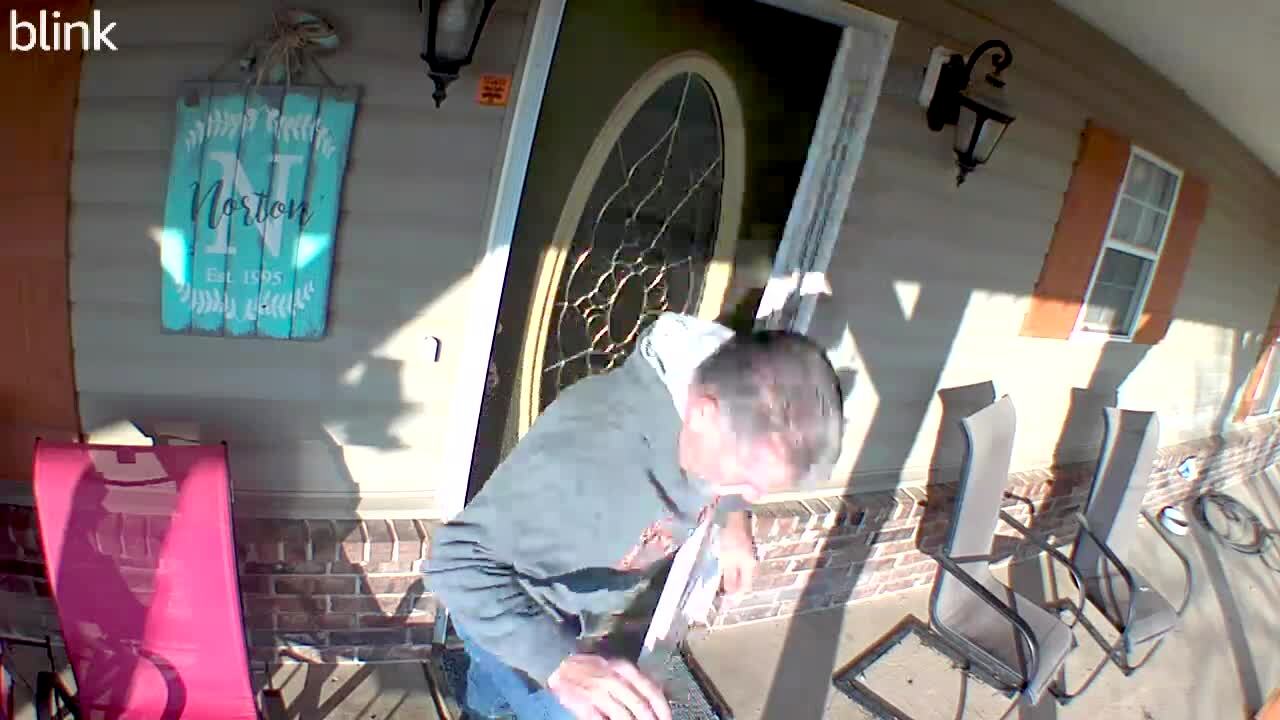 A man stands on his front porch with the door open. While he stands there, a groundhog comes from around the corner and runs into the house. Security footage.