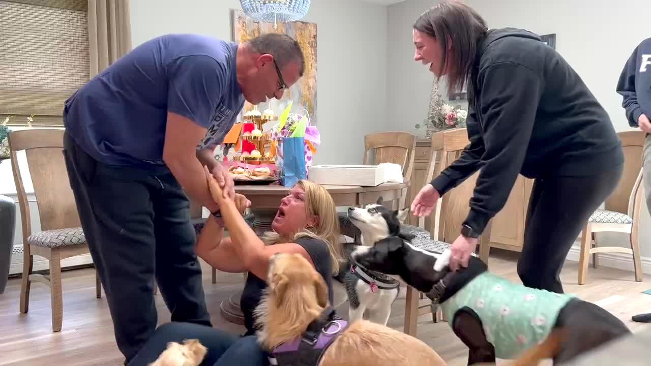 A young woman in Christmas pajamas opens a gift of keys in the living room and runs to the driveway, screaming, to see her new car. The car is a gift from her sister.
