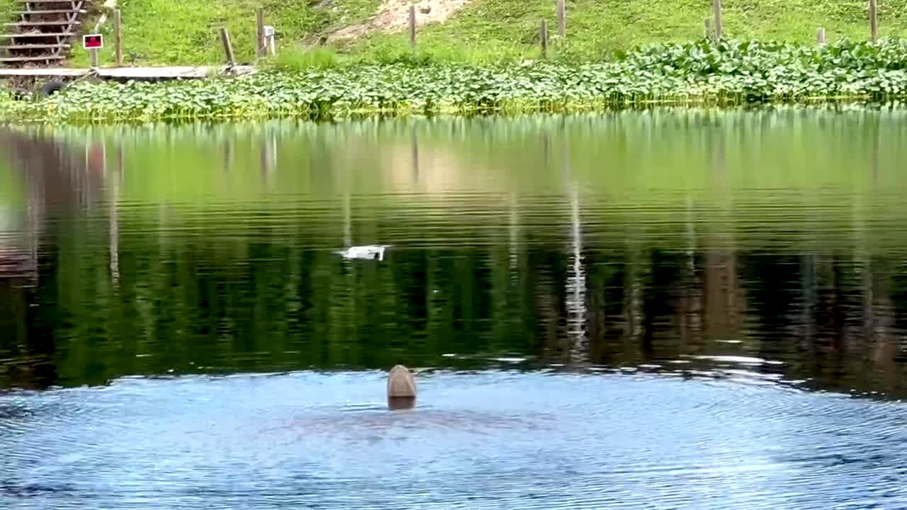 A man stands in a swimming pool in a yard and throws a water balloon into the air. It lands on his head and bursts and the balloon wraps around his head like a swimming cap then pops off on its own. Clip plays twice and the second one is in slow motion.