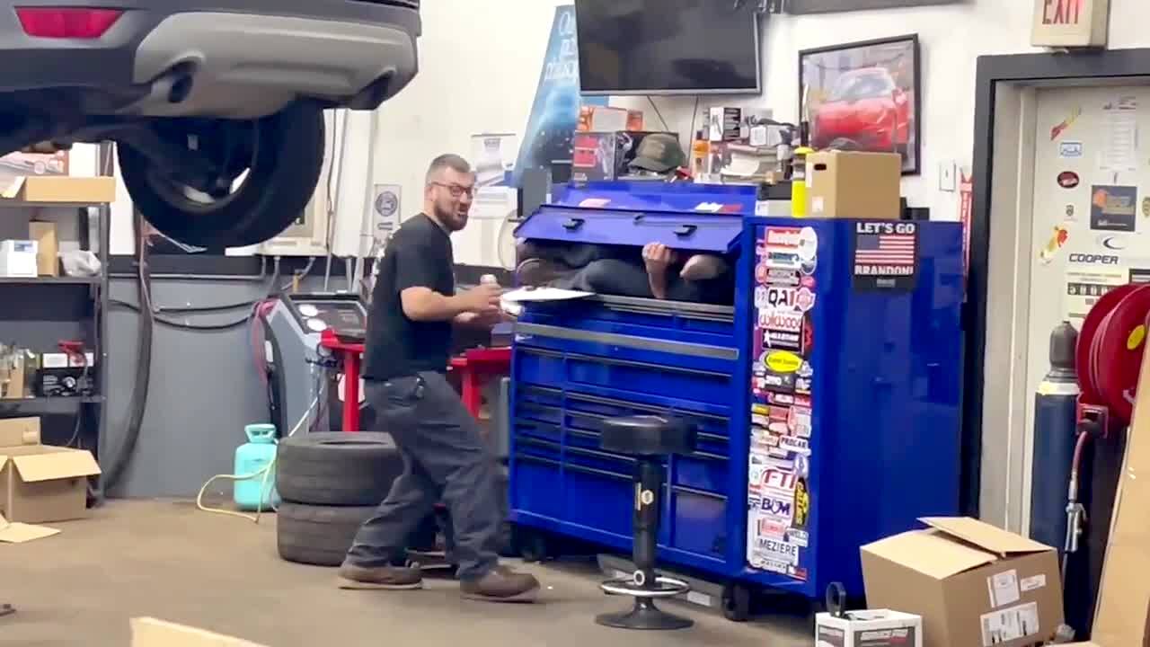 A man in a garage opens a tool box and another man is inside and startles him.