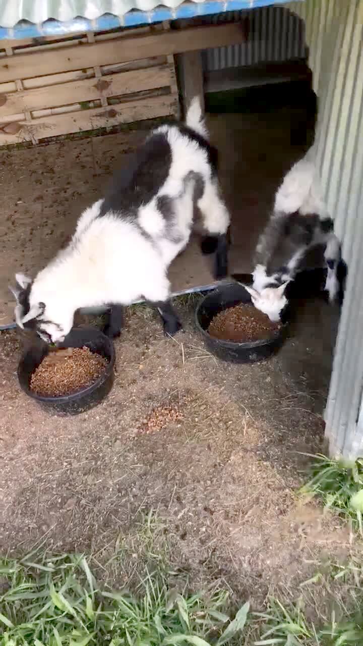 Two goats eat food on a farm and simultaneously faint when a person walks up to them.