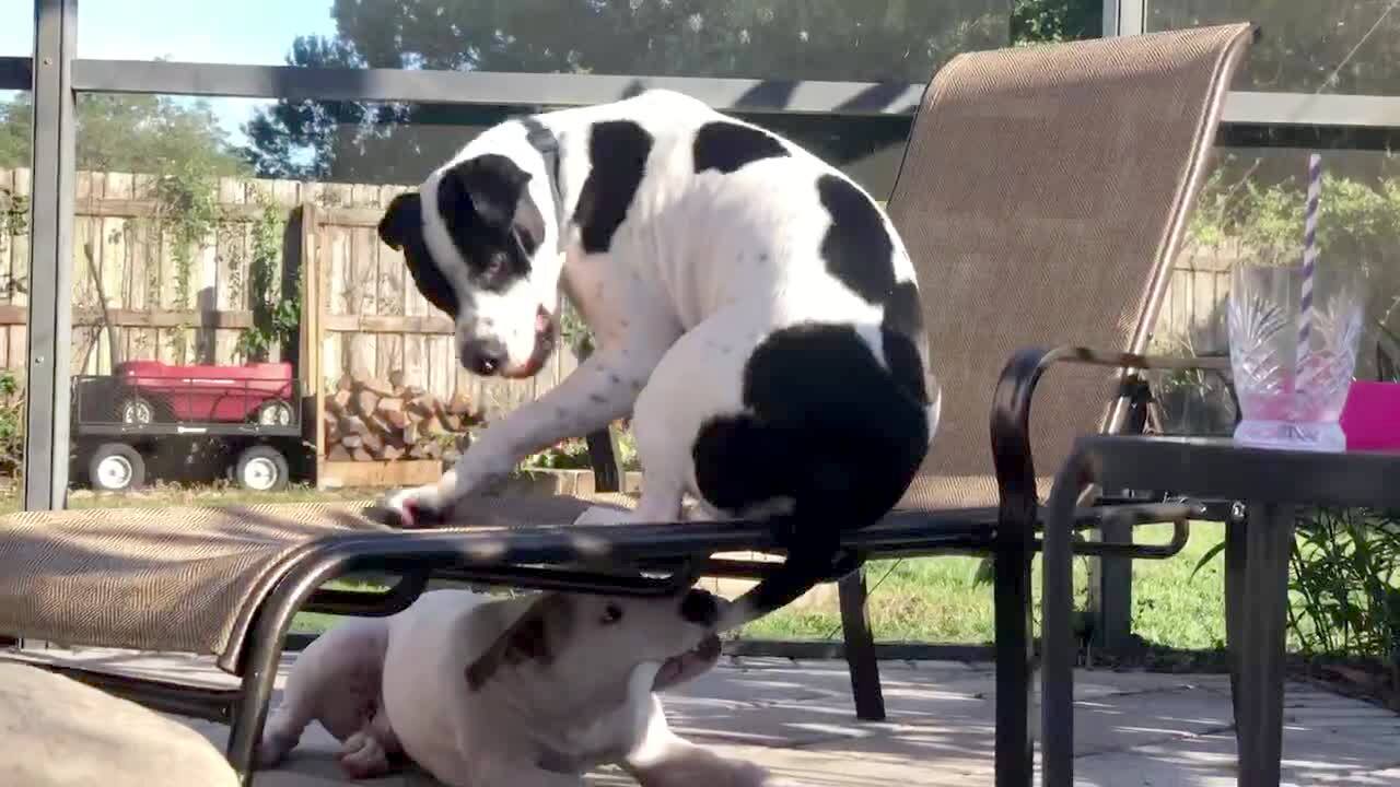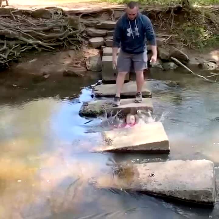 A young girl does a cartwheel in a yard and a young boy kicks a soccer ball and the ball goes through her legs as she goes upside down and the ball hits the camera. First person POV. Slow motion.