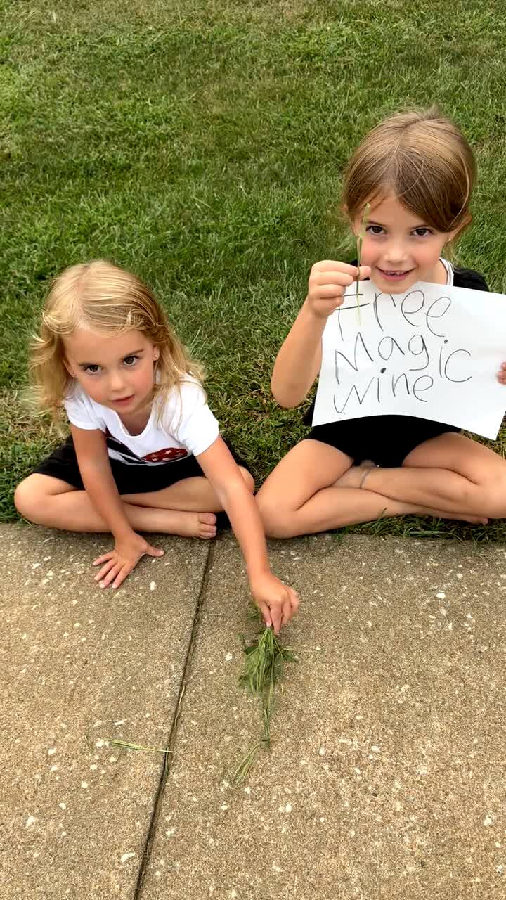 Two young girls on the sidewalk hold up a handwritten sign that they think reads "Free magic wands!" A woman helps the daughter read the sign which actually says, "Free magic wine."